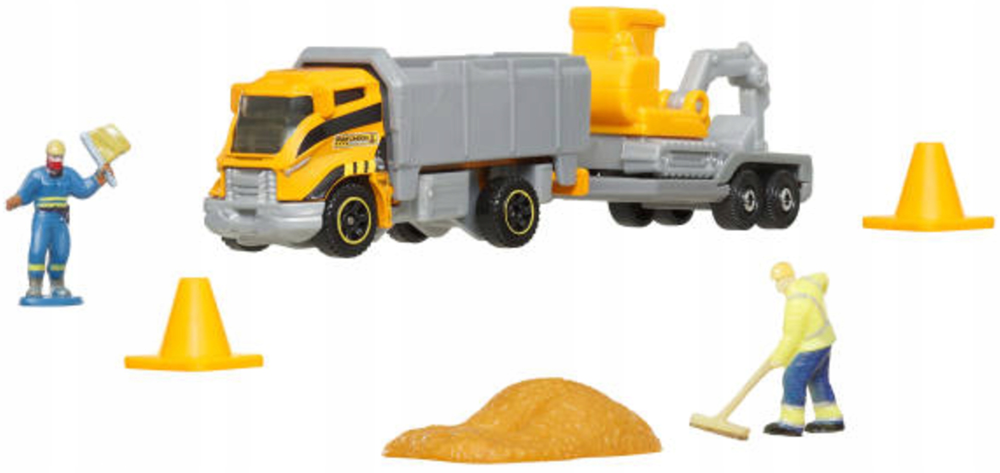 Set Adventure Pack MBX Construction Zone содержит строительный автомобиль, тянущий трейлер с экскаватором, фигурками рабочих и аксессуарами. Красочное корпус тела изготовлена из металла, с добавлением пластиковых элементов. автомобиль имеет движущиеся колеса и плавно скользит по поверхностям.