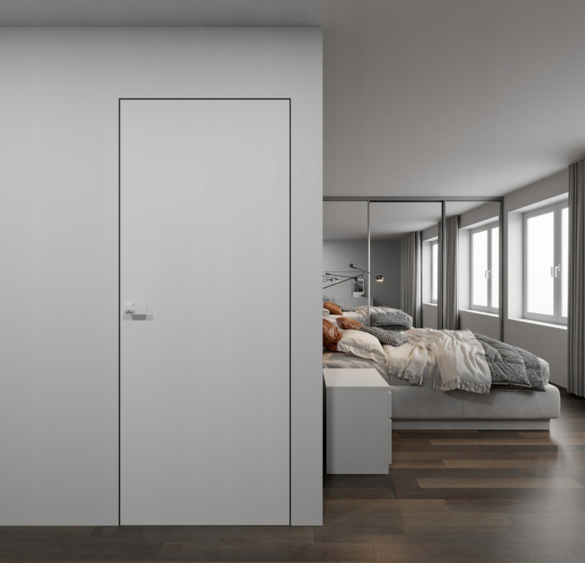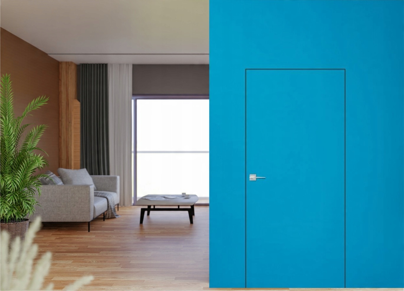 Коллекция скрытых дверей Sara Color идеально подходит для тех, кто любит инновационные решения. Двери, спрятанные в стену (вровень со стеной), подчеркивают современный стиль интерьера, а возможность индивидуальной отделки позволяет визуально скрыть дверное полотно на стене, покрыв его той же краской или принтом. Специальный тип скрытой дверной коробки для установки в стену делает ее совершенно незаметной после отделки.