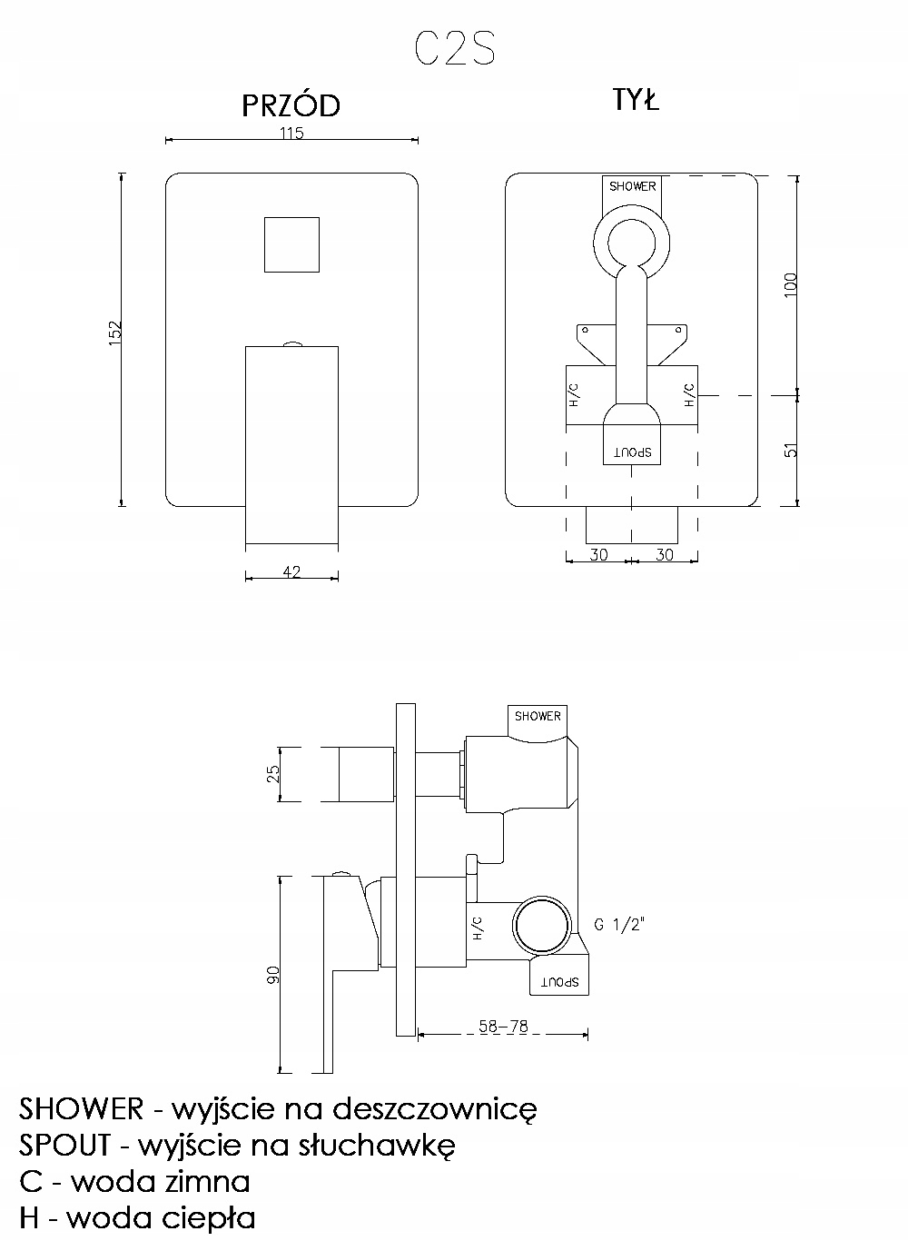 Сердцем комплекта является двухфункциональный смеситель скрытого монтажа. Корпус смесителя изготовлен из массивного латунного литья. Ручки изготовлены из хромированной нержавеющей стали. Розетка изготовлена из нержавеющей стали. Верхняя ручка представляет собой механический (безнажимной) функциональный переключатель, с помощью которого мы включаем отдельные функции: тропический душ или трубку. Нижняя ручка представляет собой смеситель, регулирующий температуру воды. Этот смеситель также используется для регулирования давления воды.