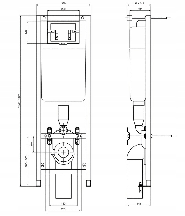 - Скрытая рама для легкой конструкции, для подвесной чаши, в комплекте с монтажными и соединительными элементами, запираемый угловой клапан для подвода воды G1/2", подача сверху , подающая труба ПЭ с прокладкой (Fi 56/40 мм вход/выход), выходные трубы ПЭ с прокладками, набор крепежных соединений с белыми заглушками для винтов, фиксирующих чашу, звукоизолированный бак с полистироловым кожухом.
