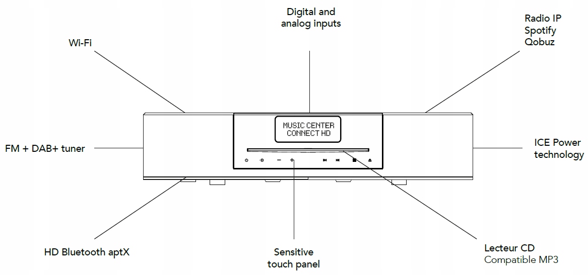Elipson Music Center — это стереоресивер с CD, Wi-Fi и BT класса D, использующий технологию ICE Power от Bang & Olufsen.