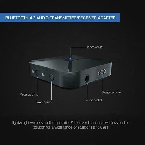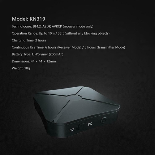 Переключайтесь между режимами отправки и получения с помощью одной кнопки. Простое подключение с помощью передовой технологии Bluetooth и аудиокабеля 3,5 мм (входит в комплект). * 5. Ультрапортативный источник питания потокового аудио. KN321 имеет высоту всего 44 мм и вес всего 18 грамм, но имеет мощную функцию беспроводной потоковой передачи звука. Поместите этот передатчик и приемник в свой рюкзак или сумку для ноутбука и возьмите его с собой. *6. Широкая совместимость. Благодаря кабелю 3,5 мм и 2-дюймовому кабелю 3,5 мм этот адаптер приемо-передатчика можно часто использовать в компьютерах, ноутбуках, стереосистемах, гарнитурах, смартфонах, MP3-плеерах, проигрывателях компакт-дисков и т. д.