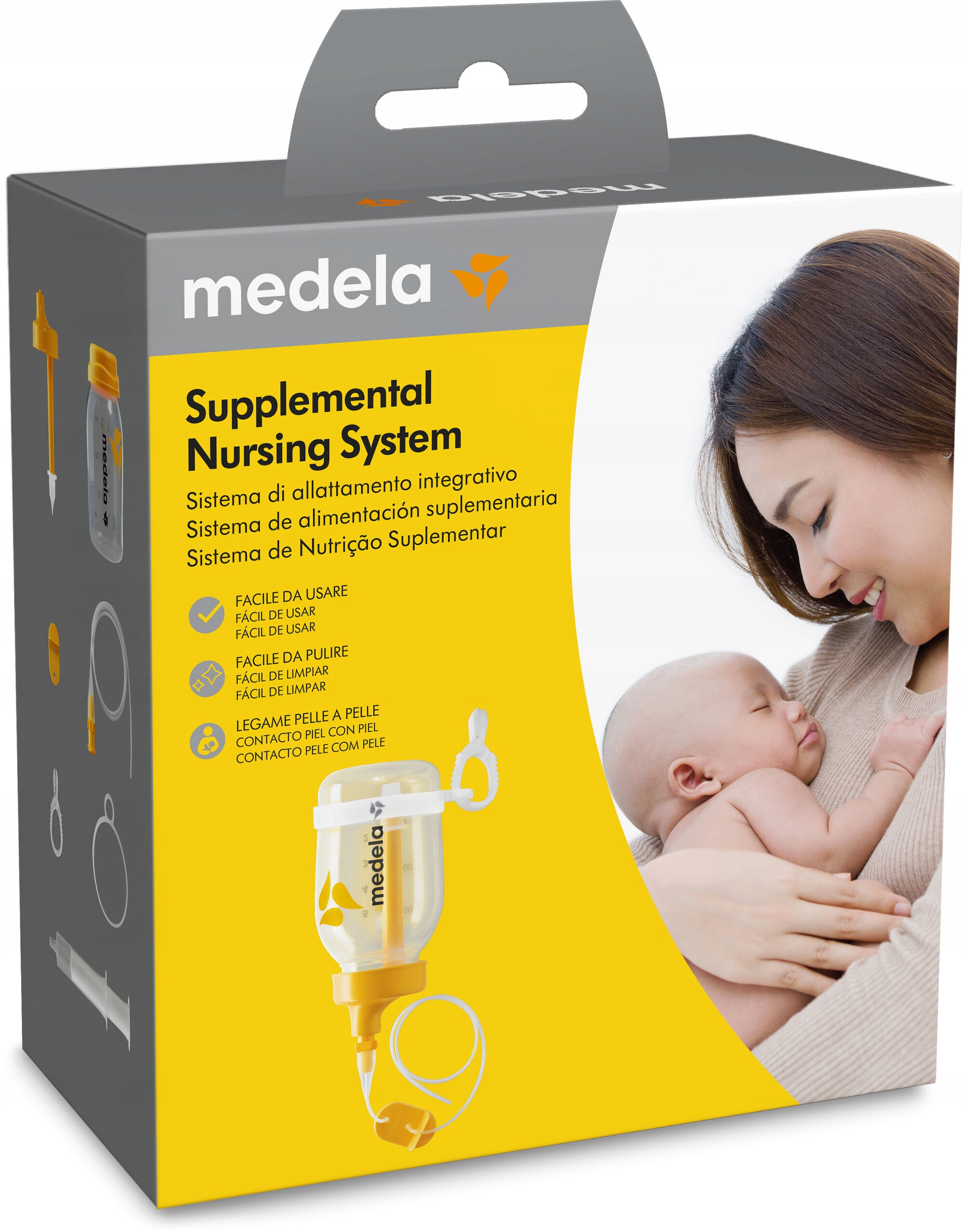 Система поддержки кормления MEDELA SNS 2.0 — отличное решение, позволяющее обеспечивать детей, находящихся на грудном вскармливании, дополнительными питательными веществами. Система поддерживает создание уникальной связи между матерью и ребенком, мотивируя их обоих улучшить грудное вскармливание. Этого можно достичь, обеспечивая новорожденного дополнительным молоком через систему кормления во время грудного вскармливания. Система помощи при кормлении позволяет матерям кормить грудью в ситуациях, когда это обычно невозможно, а также помогает малышам тренировать сосательный рефлекс. Система поддержки кормления представляет собой резервуар, наполненный дополнительными питательными веществами. Его можно разместить на груди матери или на подставке.