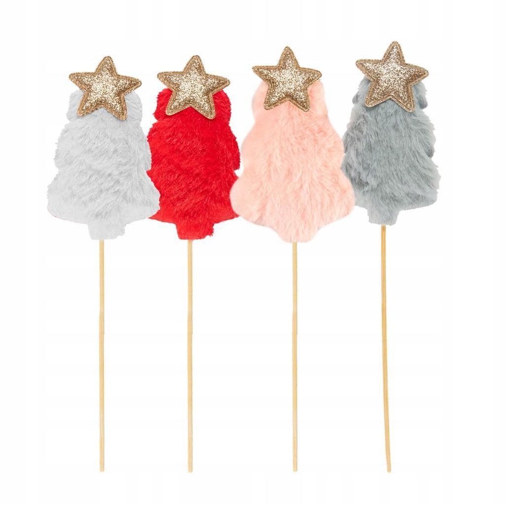Новогоднее украшение на вершине в виде ёлки. Елка покрыта мягким мехом. Вверху украшения – золотая блестящая звезда. Палочка позволяет поместить украшение в горшок, вазу, как дополнение к рождественскому букету или подарочной корзине. Доступные цвета: - розовый, - серый, - белый, - красный. Высота елки с палкой 22 см.