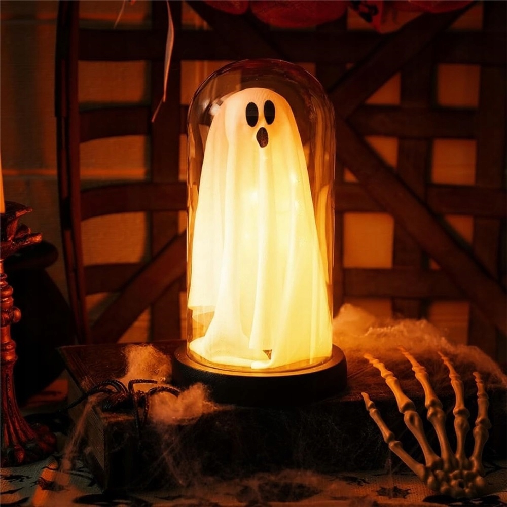 Призрак в стеклянном куполе имеет встроенную светодиодную подсветку. Его нежное свечение идеально подходит для создания атмосферы во время встреч в честь Хэллоуина.