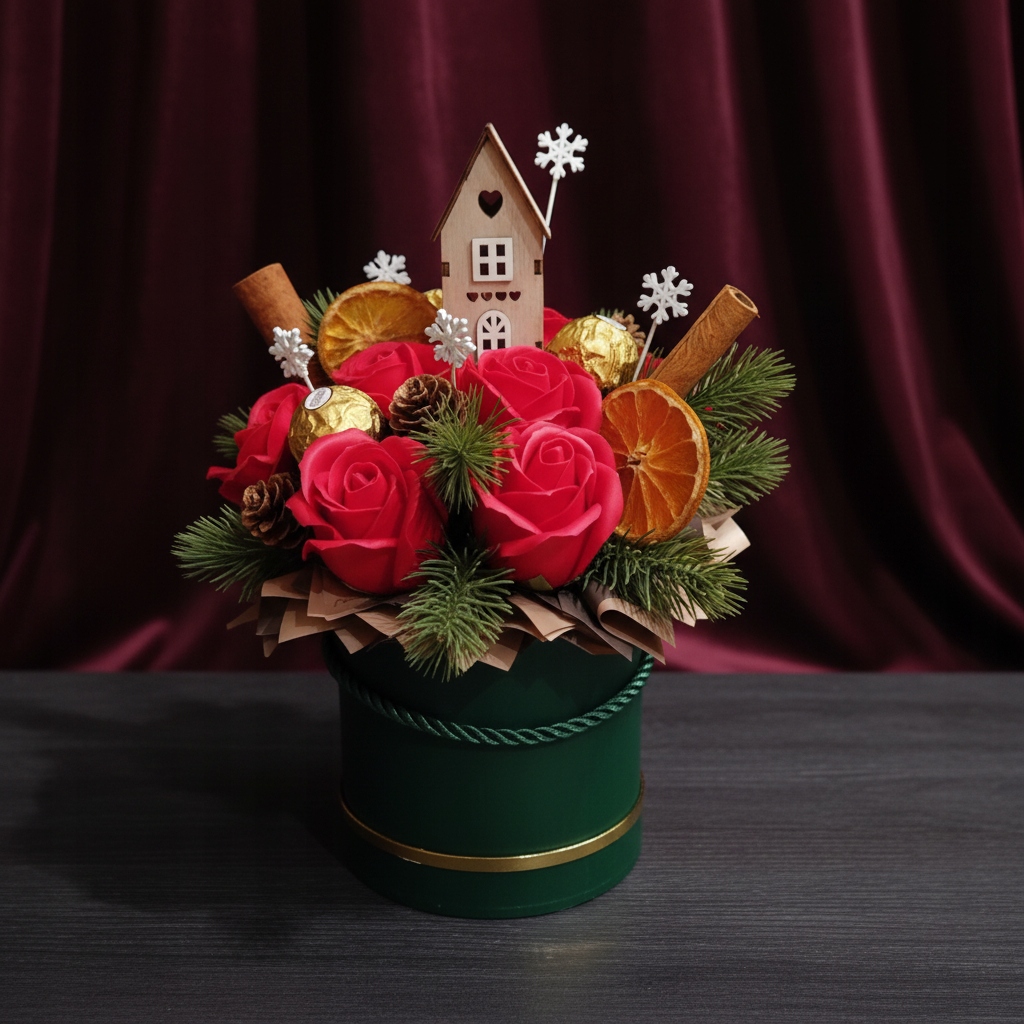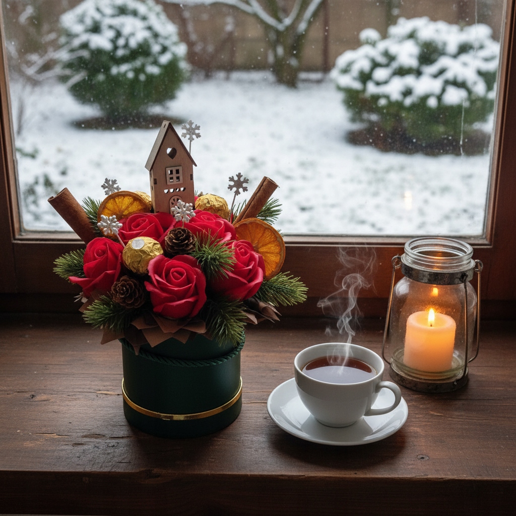 ✨ ЗИМНЕЕ ЗАКЛИНАНИЕ В КОРОБКЕ: ВОЛШЕБНЫЙ РОЖДЕСТВЕНСКИЙ БУКЕТ С РОЗАМИ И СЛАДОСТЯМИ! ✨