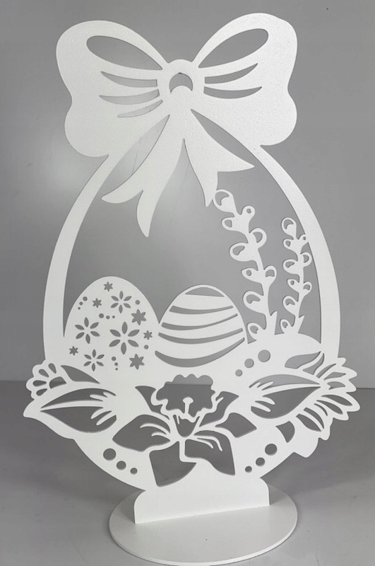 декоративная пасхальная корзина, сделанная из металлического порошка, окрашенного в белый цвет.