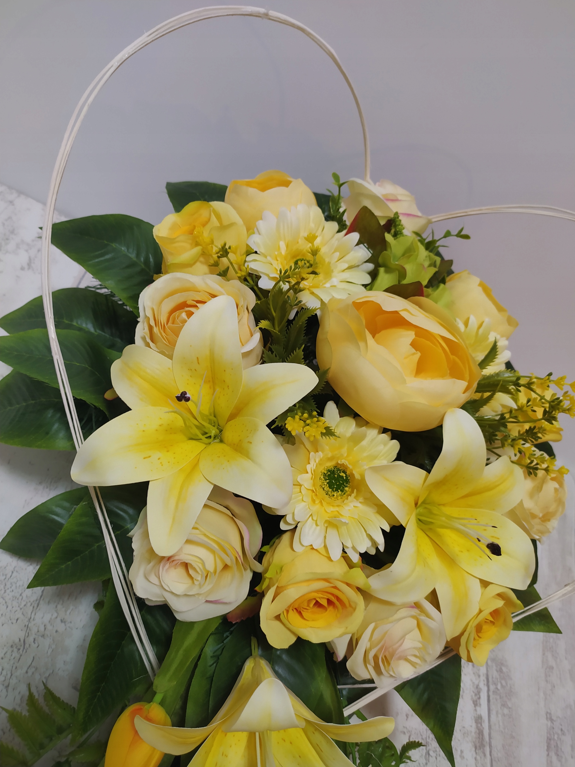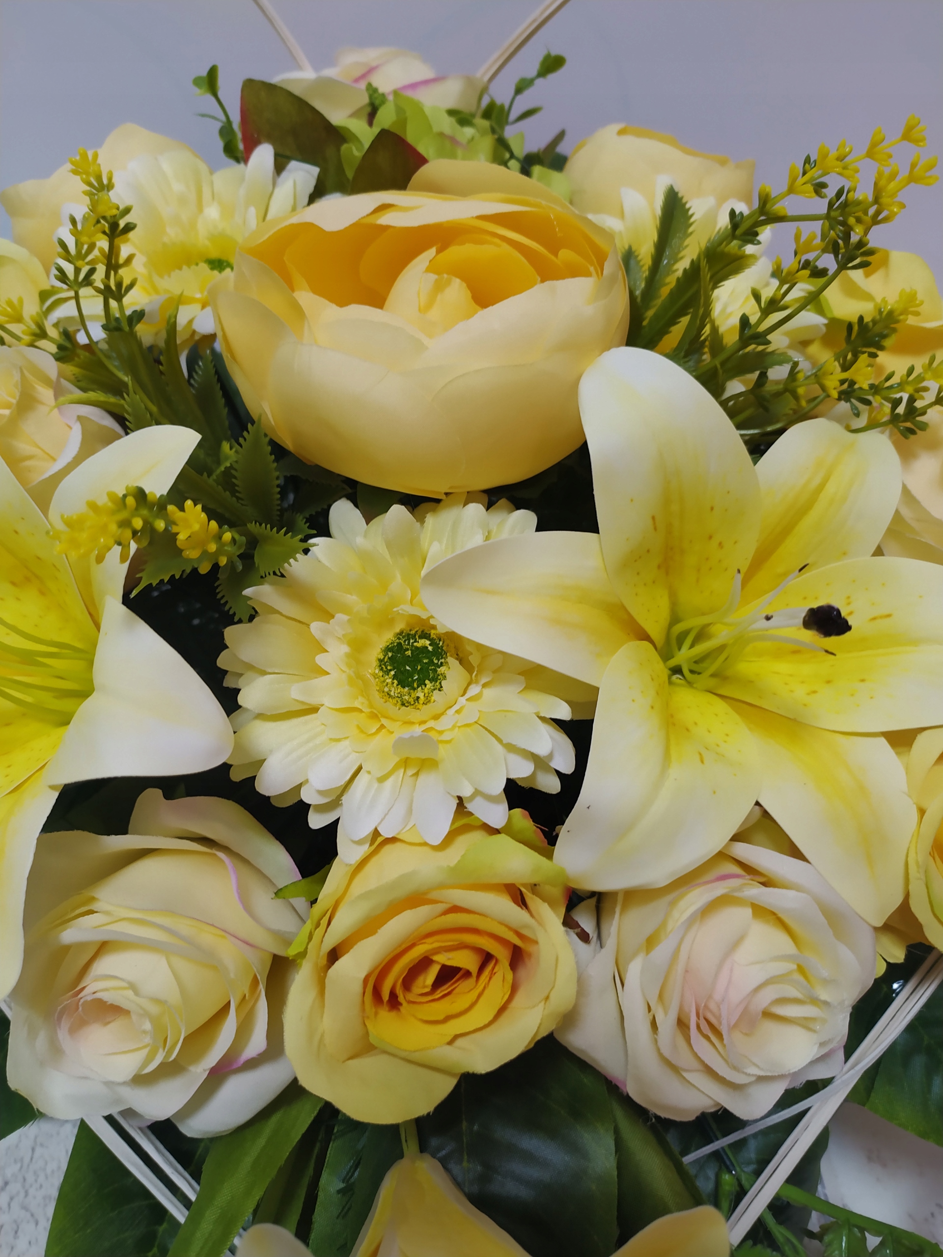 Красивое могильное украшение из искусственных цветов, продолговатая композиция для плиты. Мы сами тщательно составляем наши композиции, благодаря чему трости уникальны и в жизни выглядят еще лучше.