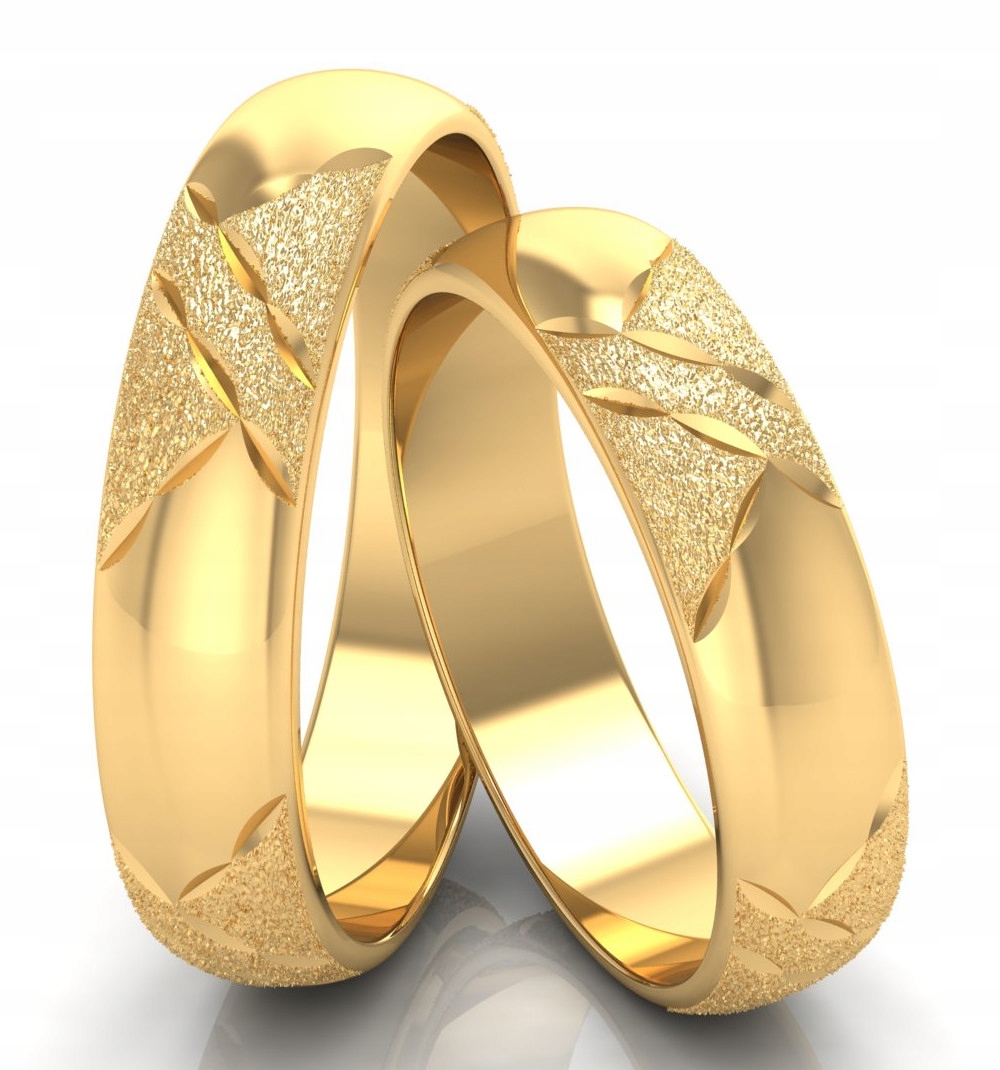 Декорированные обручальные кольца полукруглого профиля из 14-каратного золота. На их поверхности с помощью алмазного резака были сделаны надрезы, благодаря которым ажурные углубления прекрасно отражают свет. Они окружают элементы матовым покрытием. Текстурированная поверхность излучает атласное сияние и красиво контрастирует с полированной остальной частью рисунка. Украшение красиво освещает всю композицию и подчеркивает благородную красоту золота.
