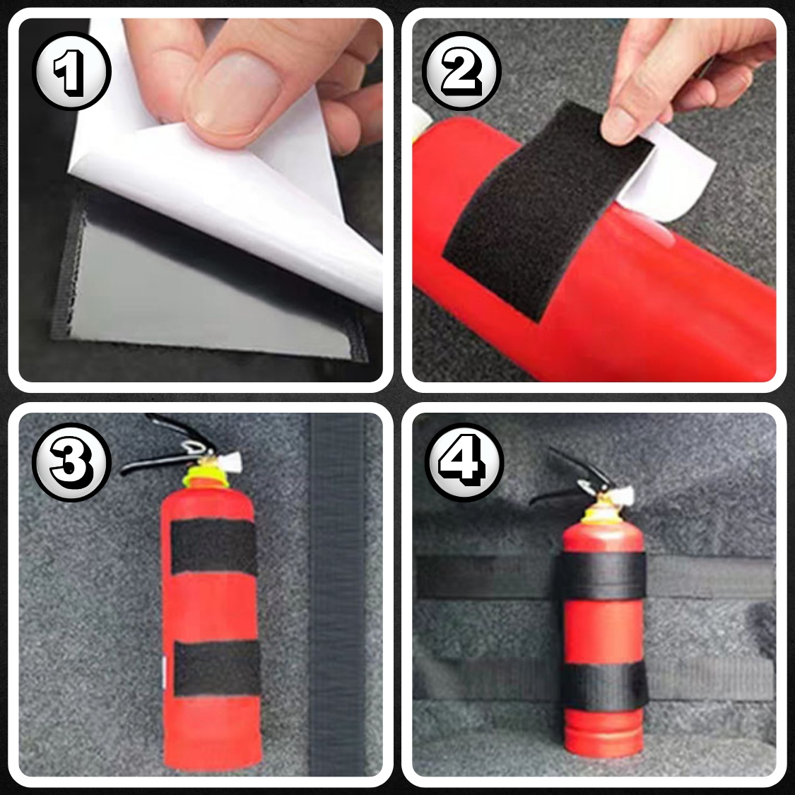 - Сильная липучка сохраняет огнетушитель в одном месте, устраняя риск движения во время вождения