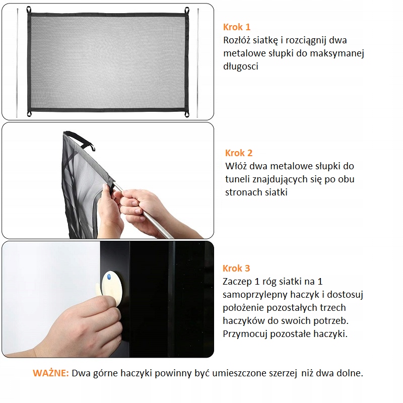 Продукт прост в установке. Все, что вам нужно сделать, это прикрепить самоклеящиеся держатели, например, к стене, затем вставить элементы жесткости и повесить сетку. Продукт легкий и портативный, его легко устанавливать, снимать и хранить. Его можно взять с собой куда угодно и легко сложить, когда он не используется.