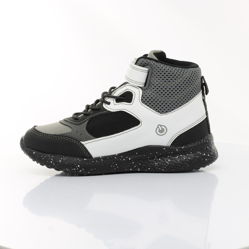 Спортивные кроссовки черного/белого/серого цвета, изготовленные из материалов высочайшего качества. Обувь достаточно устойчива и гибка. Профилированная кожаная стелька формирует правильное развитие стопы. Регулируемая застежка на липучке и прорезиненном шнурке. Гибкая и нескользящая подошва. Носок обуви фиксируется подошвой. Обувь, светящаяся сверху разными цветами - при ходьбе - включение/выключение.