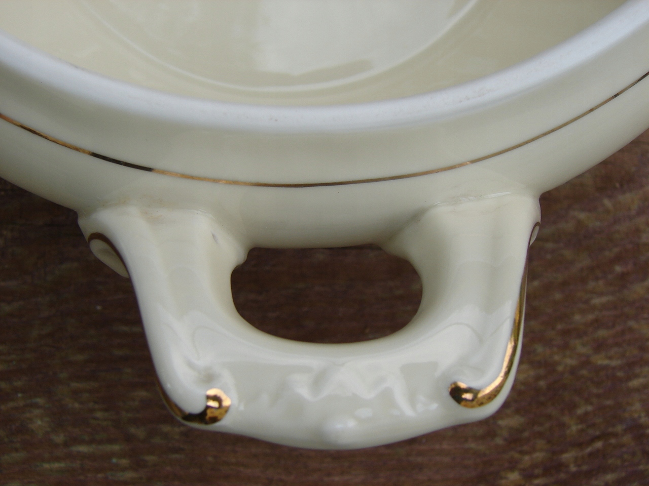 Старая ваза для подачи супов из фарфора в оттенке экру, украшенного рельефом и украшением в старом золоте.