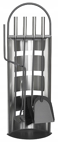- Каминный набор, состоящий из 5 элементов:подставка, кочерга, щипцы, совок, венчик. Все они незаменимы, когда речь идет об инструментах для ухода за огнем, облегчают чистку и разложение горящего материала.