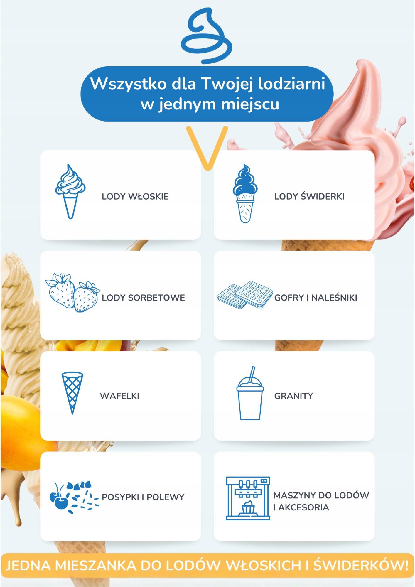 Если вы управляете Ice Business, вы попали в нужное место! Мы предлагаем более 30 уникальных ароматов концентратов для итальянского мороженого, świderków и гранитов. В нашем предложении вы найдете не только продукты высочайшего качества, но и комплексное оборудование для мороженого , доступное на наших других аукционах.