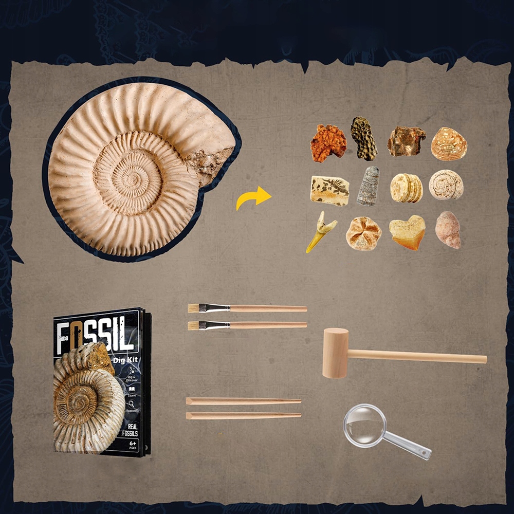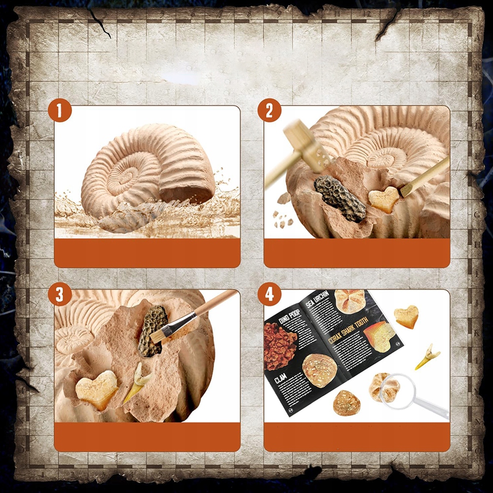✔️【Как начать археологические раскопки】Чтобы избежать беспорядка во время ваших Прежде чем начать раскопки, положите на рабочее место старую газету или бумажное полотенце. Затем замочите аммоноидея на некоторое время в воде, чтобы облегчить копание, и используйте инструменты для копания, чтобы добыть уникальные окаменелости. Медленно удалите пыль кистью. Промойте чистой водой, и вы получите желаемые окаменелости!
