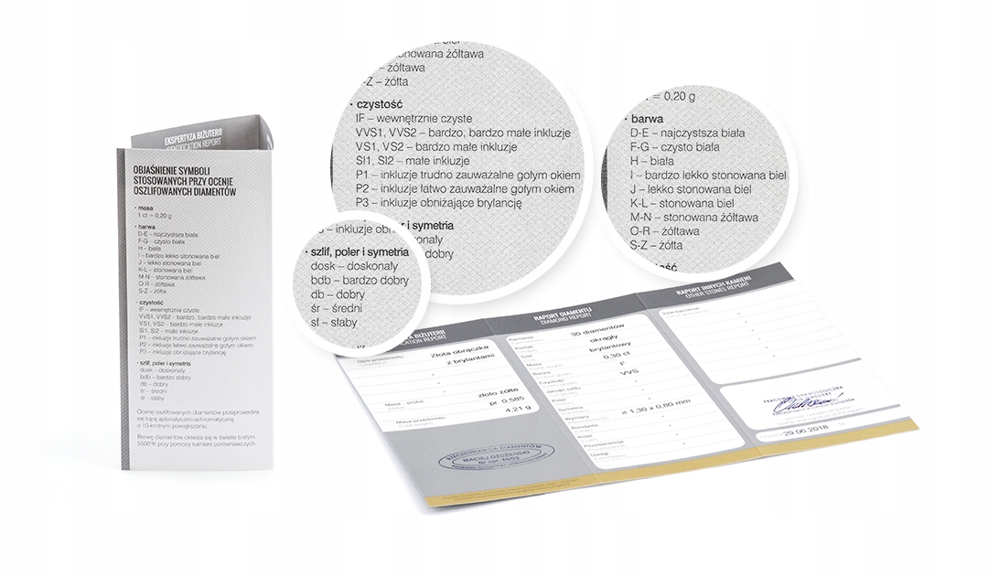 К каждому бриллианту прилагается сертификат подлинности на польском языке, выданный сертифицированным геммологом международной геммологической лаборатории IGI.
