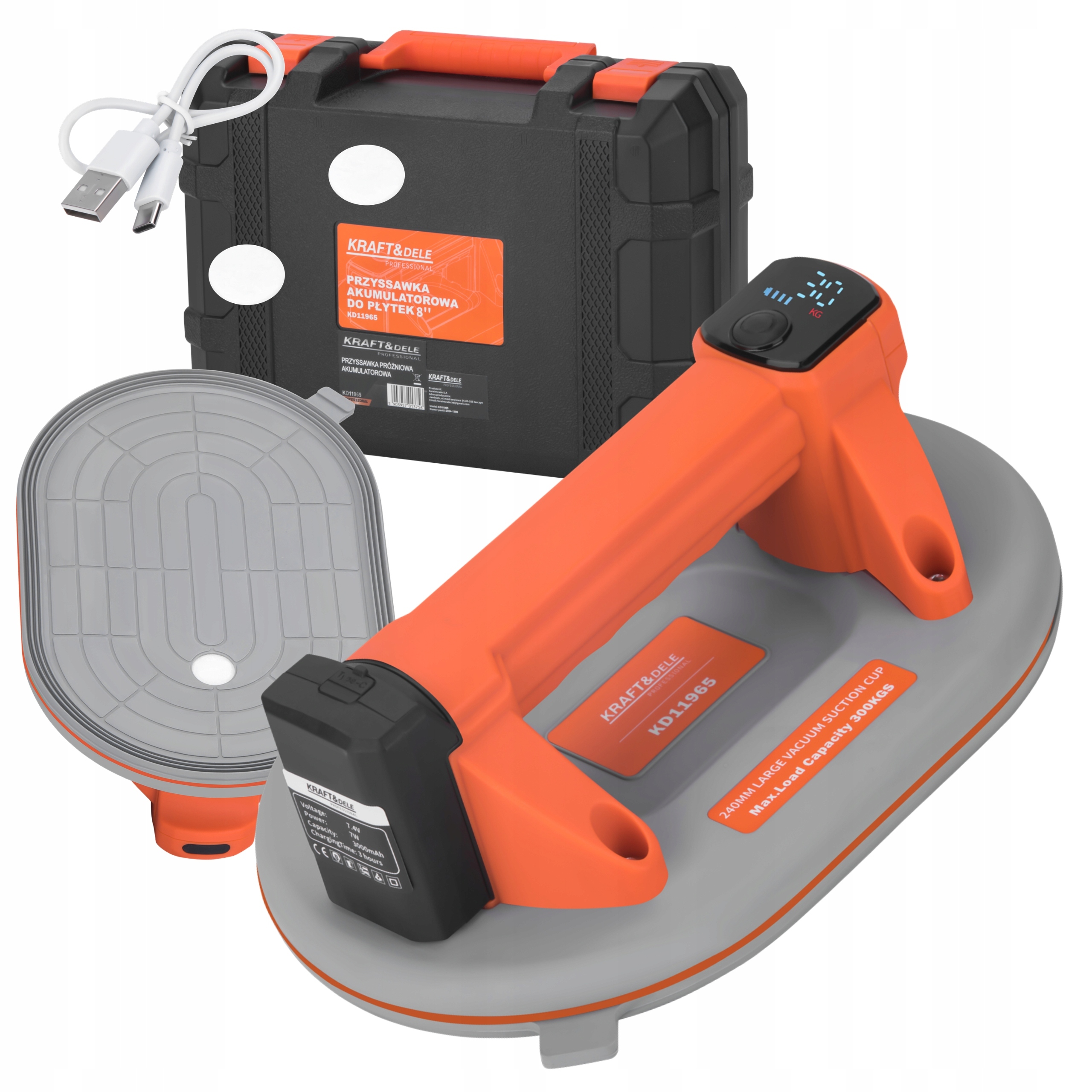 KD11965 — профессиональная беспроводная присоска диаметром 240 мм и максимальной грузоподъемностью до 300 кг. Устройство создано для безопасного и удобного обращения с элементами с гладкой поверхностью, такими как стекло, каменные плиты или металлические листы.