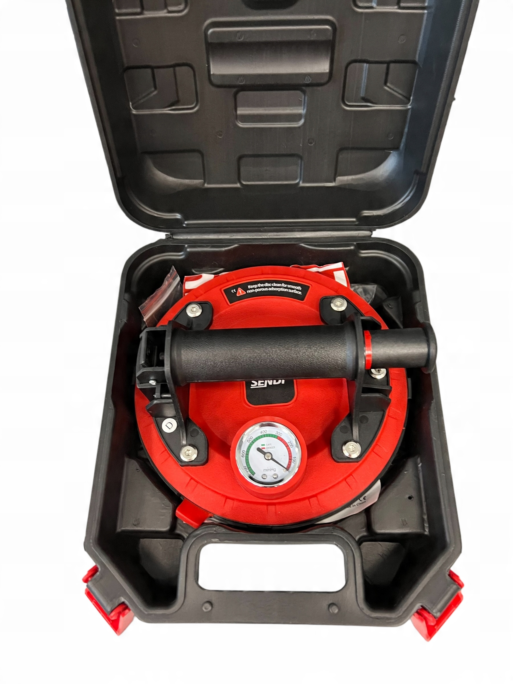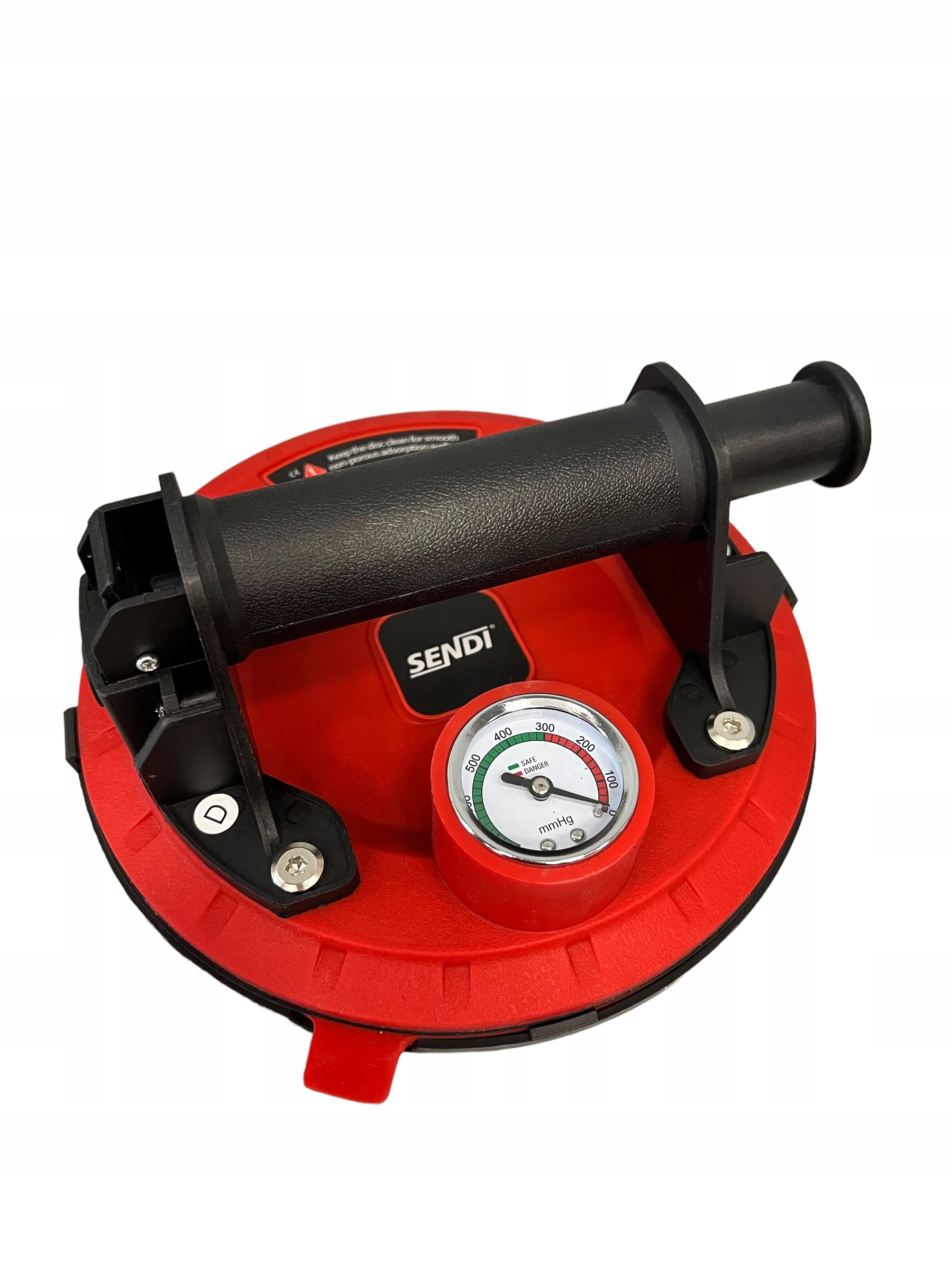 Вакуум силиконовая присоска SC-20S SENDI с манометром 200 мм, предназначенная для гладких поверхностей - керамической плитки, стекла, керамогранита, столовых/алюминиевых плит и гладкого камня. Благодаря силиконовой присоске она не пачкает поверхность плитки.