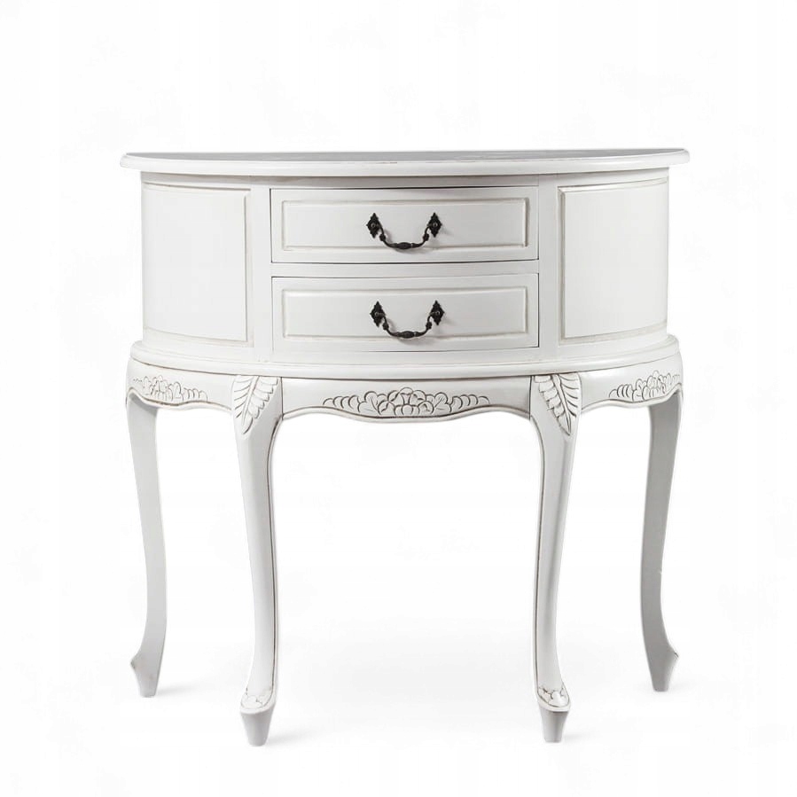 Красивая, полукругальная стена консоль в белом, древнем. Мебель из ручной вырезанной экзотической древесины. Два вместительных ящика под столешницы. Консоль была установлена на декоративных, согнутых ногах. Идеально подходит для стильно меблированного зала. Блэк -металлический ручки.