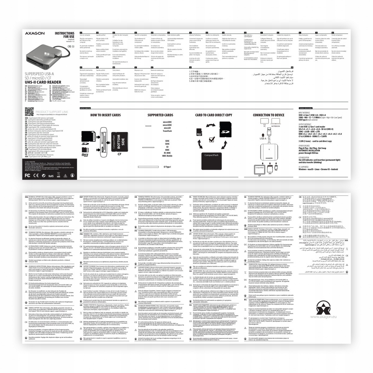 В комплект поставки входят: USB-кардридер SuperSpeed, многоязычное руководство CZ / DE / DK / ENG / ESP. / FIN / FR / GR / HR / HU / IT / NL / PL / PT / RO / RU / SK / SWE / TR / BG / CN / ARA, упакованы в картонную коробку с отверстием для подвешивания.