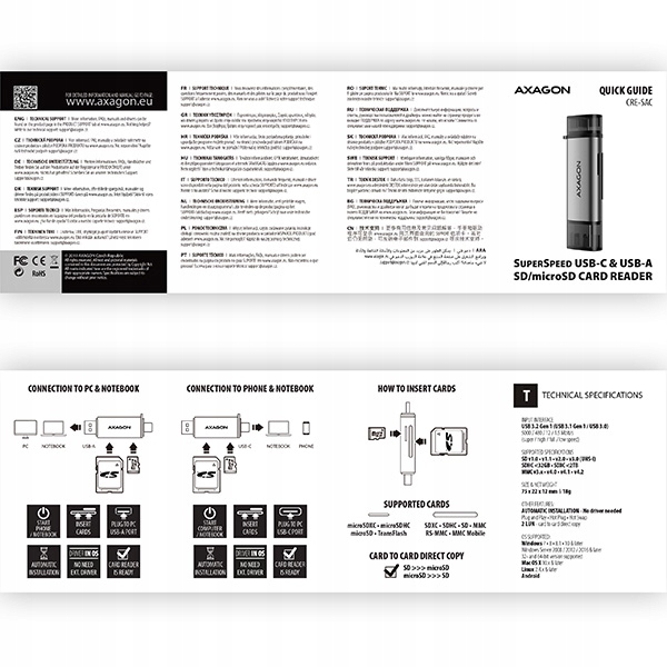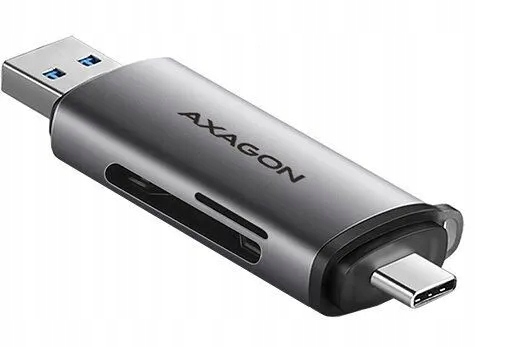 Универсальный портативный USB-кардридер SuperSpeed AXAGON CRE-SAC поддерживает все актуальные версии карт SD и microSD, включая SDXC и microSDXC емкостью до 2 ТБ. Благодаря двум разъемам USB-C и USB-A ридер можно напрямую подключать к настольным компьютерам или ноутбукам, а также мобильным телефонам и планшетам с разъемом USB-C. Благодаря интерфейсу USB 3.2 Gen 1 / USB 3.0 считыватель обеспечивает значительно более высокую скорость передачи данных для картUHS-I SD по сравнению со считывателями USB 2.0. Кардридер позволяет одновременно обрабатывать карты в обоих слотах и осуществлять прямое копирование между ними. Металлический корпус ридеране только отлично выглядит, но и повышает его долговечность. Оба разъема при транспортировке защищены заглушками. Входящий в комплект шарнир позволяет прикрепить устройство считывания карт к брелоку для ключей. Установку могут выполнить не только профессионалы – достаточно вставить ридер в USB-порт компьютера или портативного устройства, а все остальное происходит полностью автоматически.