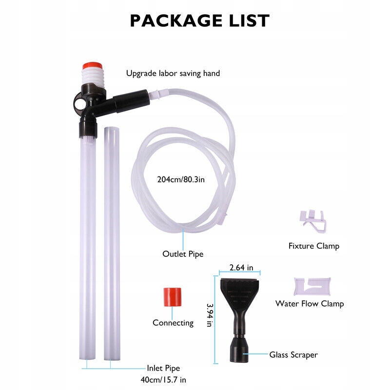 • 【Простота эксплуатации】 Подключите впускную и выпускную трубу и поместите впускное отверстие для воды в аквариум, а выпускное отверстие в ведро. Нажимайте кнопку подачи воздуха, пока вода не выйдет автоматически. Вы можете опустить подачу воды, чтобы очистить фекалии или остатки пищи. Примечание: положение выхода воды должно быть меньше, чем входа (не менее 50 см)