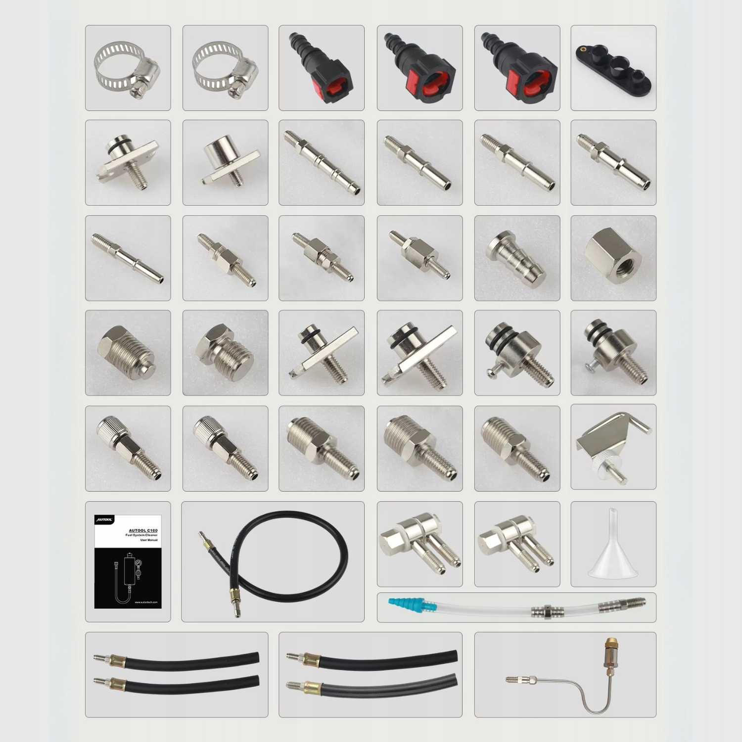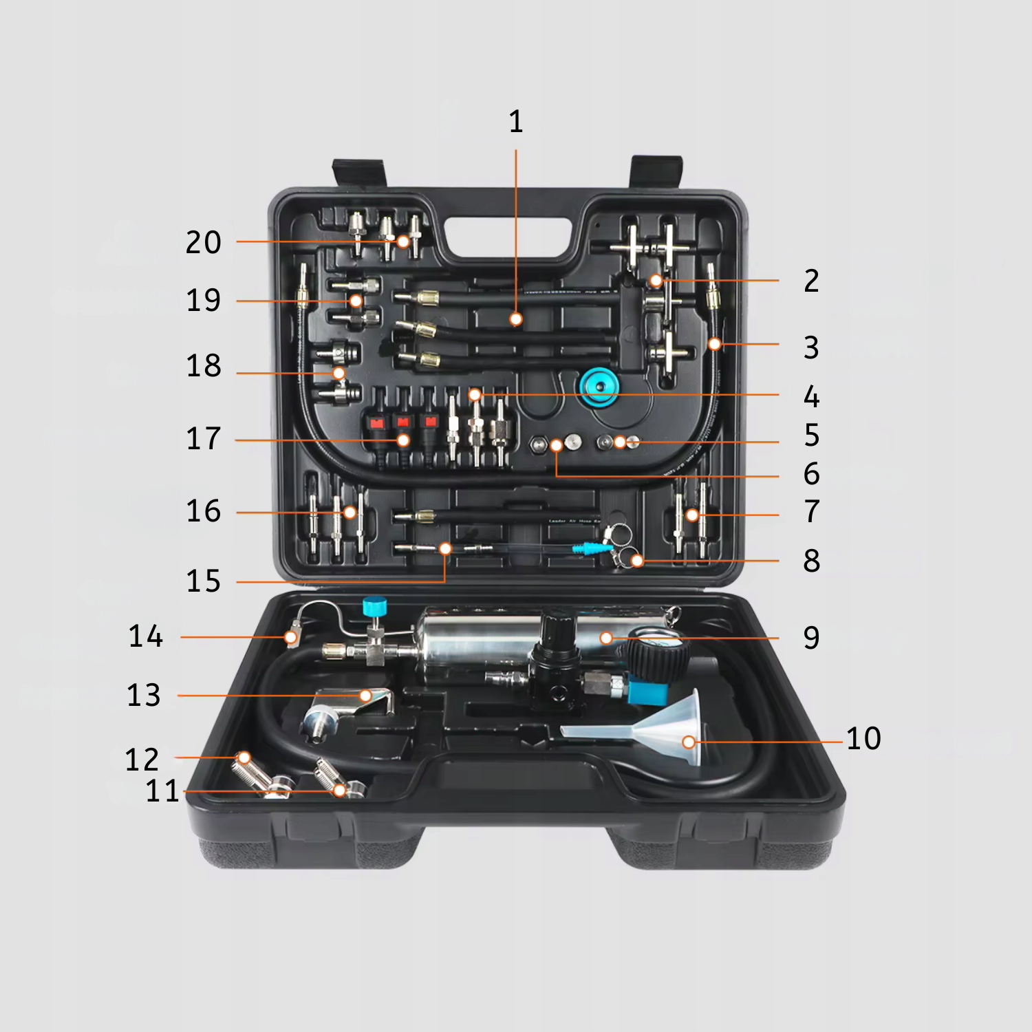 Наборы чистки инжекторов содержат много различных типов адаптеров, покрывают почти все автомобили и легкие грузовики в ЕС, Азия, США. Рекомендуется для безошибочных форсунок дроссельной заслонки и топливной системы. Система не только характеризуется функцией очистки высокого и низкого давления. В то же время он поддерживает функцию всей топливной системы, камеры сгорания в нескольких основных функциях в одном продукте, таких как очистка дроссельной заслонки и топливного сопла.