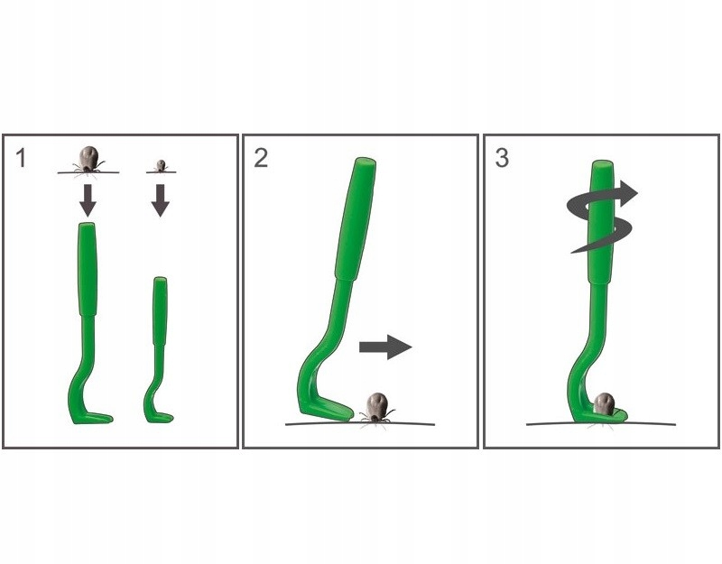 Крючок состоит из ручки и двух зубцов, которые вводятся между кожей и клещом (как можно ближе к коже). отвинтите паразита, слегка приподнимите крючок и поверните ручку 2-3 раза. Операция занимает всего несколько секунд и требует применения дезинфицирующего средства только после удаления клеща.
