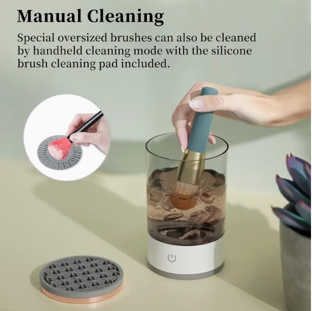 Многофункциональное компактное устройство для чистки косметических кистей 4в1. Он обеспечивает эффективную, глубокую и бережную очистку, поэтому ваши кисти для макияжа всегда будут чистыми и готовыми к использованию.