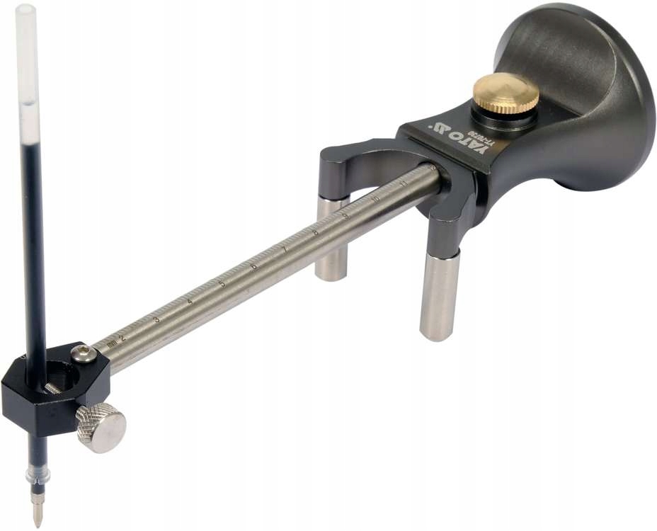 Соберите кронштейн, вставив держатель в отверстие в корпусе, поместите маркер, стилус или карандаш в держатель на конце рычага. Разместите направляющие ролики на боковой кромке обрабатываемого материала, например, столешницы, доски или плиты. Прижимая валики к материалу, перемещайте их по краям, стилус на кронштейне отмечает линию на поверхности.