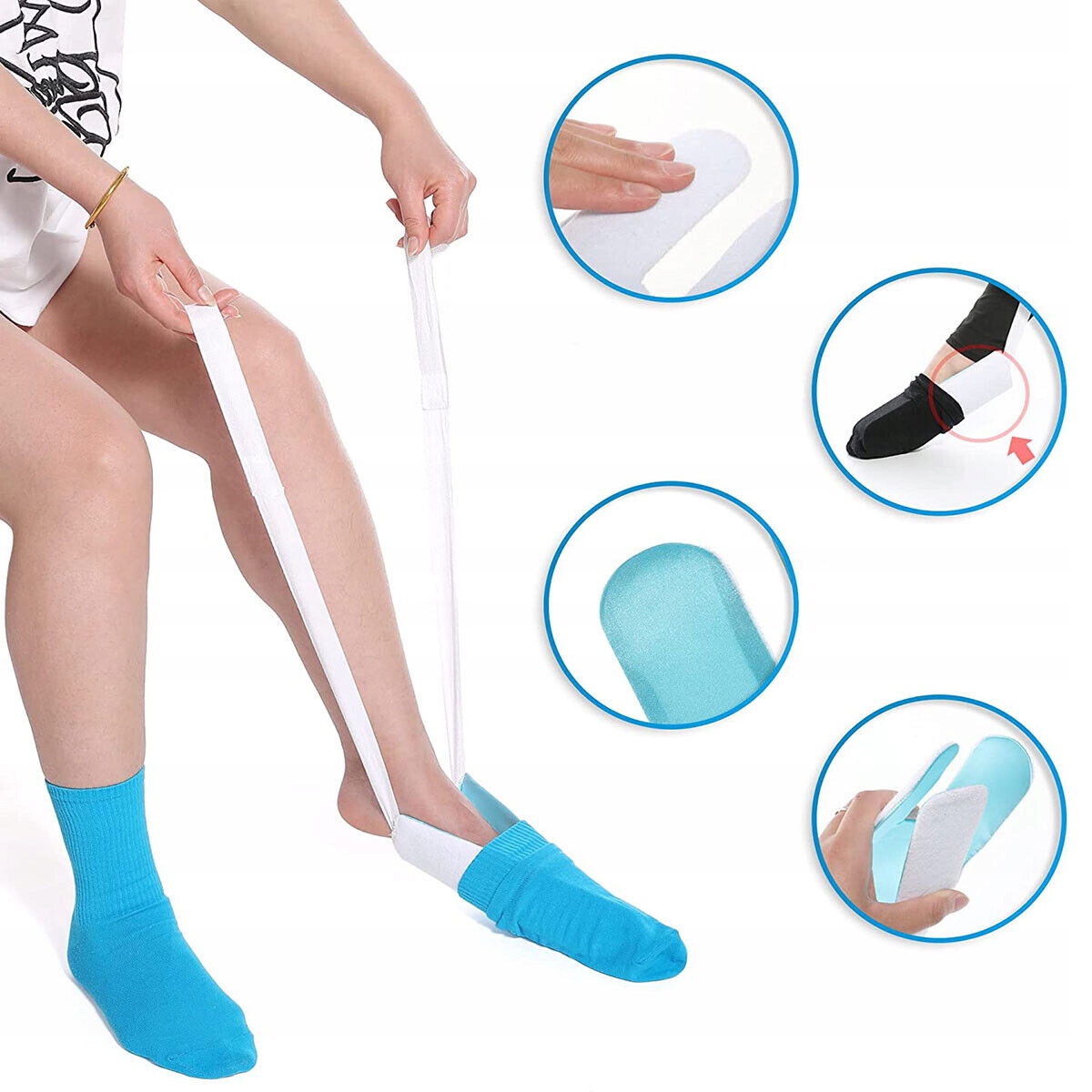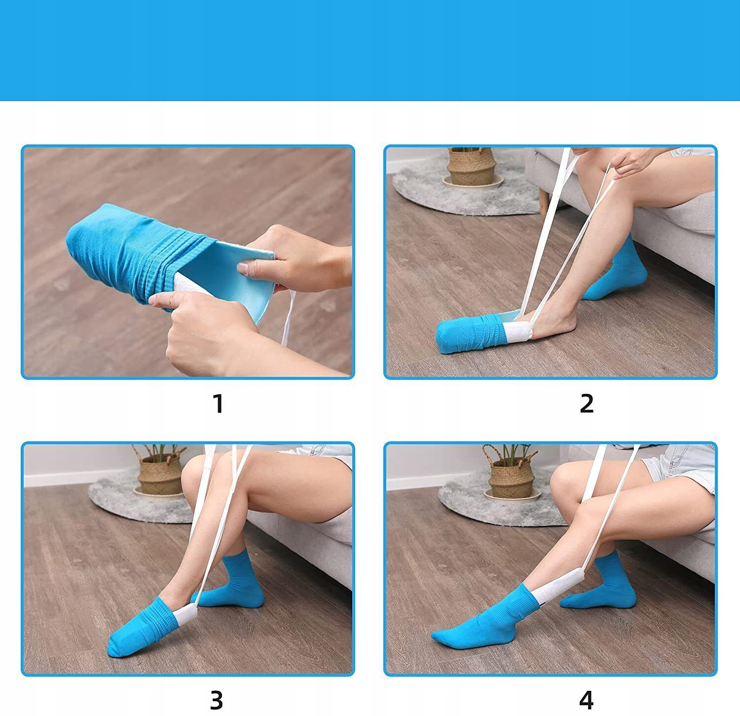 🧦🧦 Три шага, чтобы легко надеть носки: (1) Наденьте носок на конец вспомогательного устройства. , (2) Поместите ногу в зазор между носком и вспомогательным устройством, (3) Потяните за веревку. Простота в использовании.