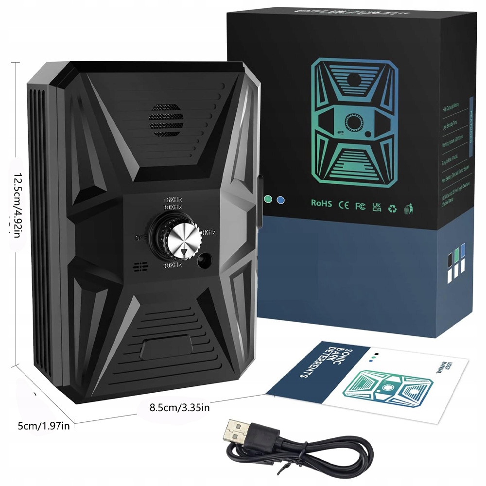 Антисипное устройство с 3 различными частотами, эффективно предотвращает лаящие собаки разных размеров. Частота 15-30 кГц может предотвратить лай крупных и непослушных собак на расстоянии 10 м, частота 20 кГц может предотвратить лай средней и простой собаки на расстоянии 6 м, а частота 30 кГц может предотвратить лай мелких собак на расстоянии 3 м.