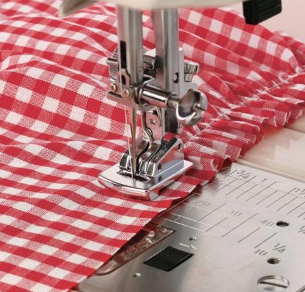 Стопа позволяет создать элегантную и ровную сборку. Поэтому это идеальное решение для людей, которые хотят украсить платья, блузки, шторы или оригинально создать украшения. Наилучшие результаты будут достигнуты на тонких и деликатных тканях. В случае более толстых материалов сморщивание будет более деликатным. Жесткие ткани можно смягчить, слегка сбрызнув их водой перед складыванием. Внешний вид сборки также зависит от длины стежка и натяжения верхней нити – чем выше значения длины и натяжения, тем плотнее будет сборка. С помощью этой лапки следует собирать только один слой ткани и не тянуть ее во время шитья.
