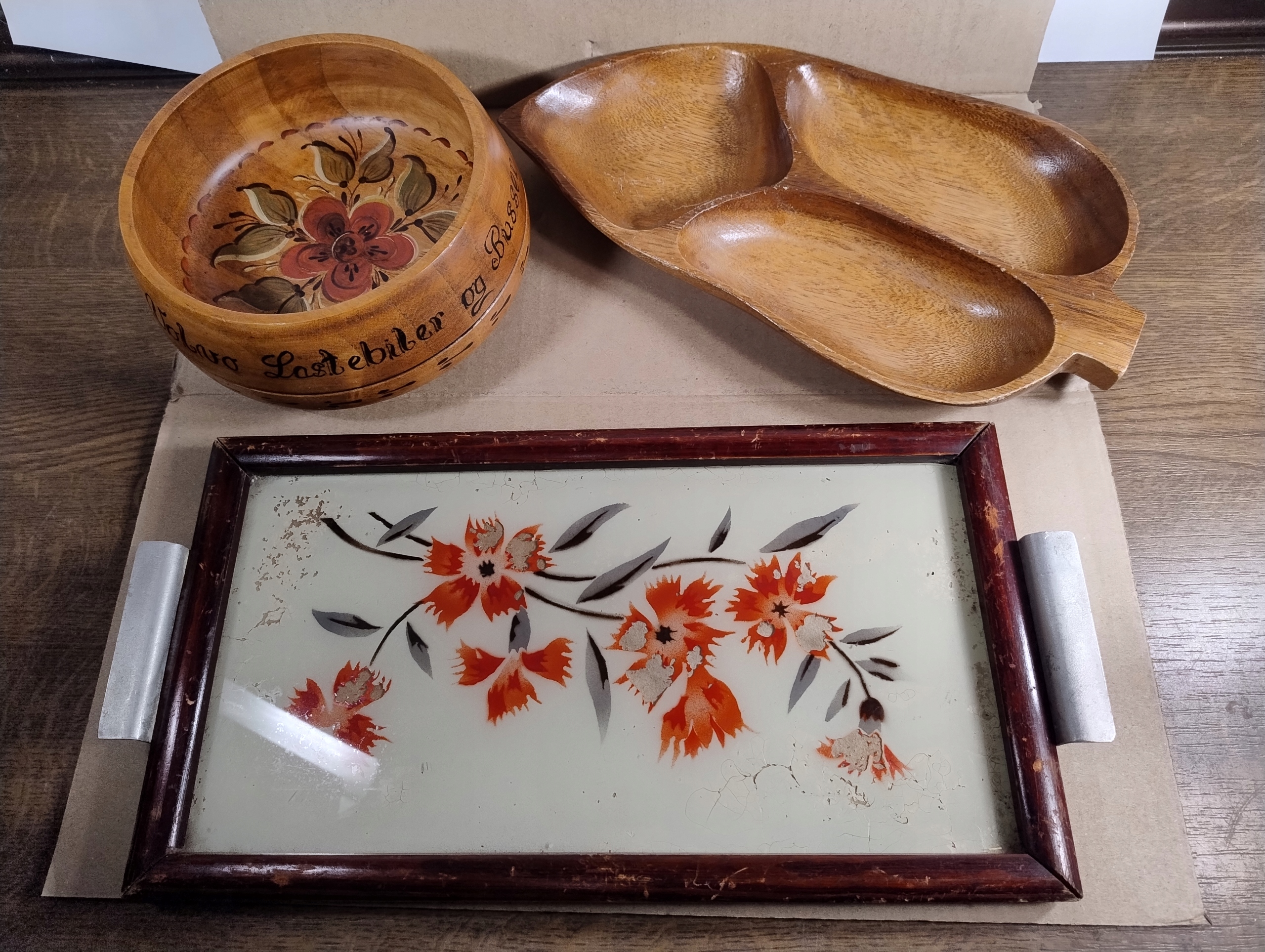 Продаю набор сувениров из Польской Народной Республики, две красивые деревянные миски ручной работы, контейнеры и старинный поднос для чая, расписанный вручную под стеклом, привезенный из Японии в 1950-е годы