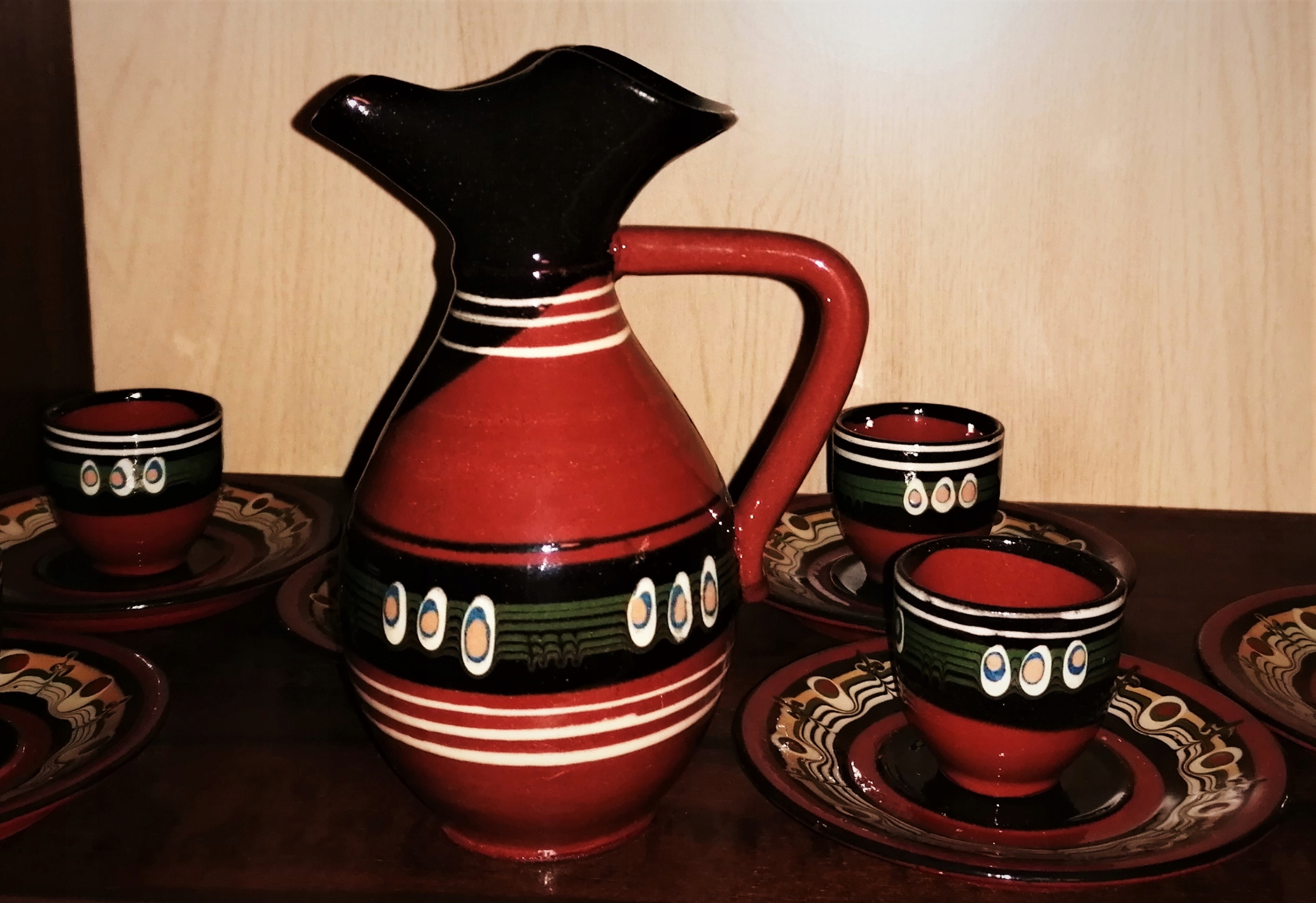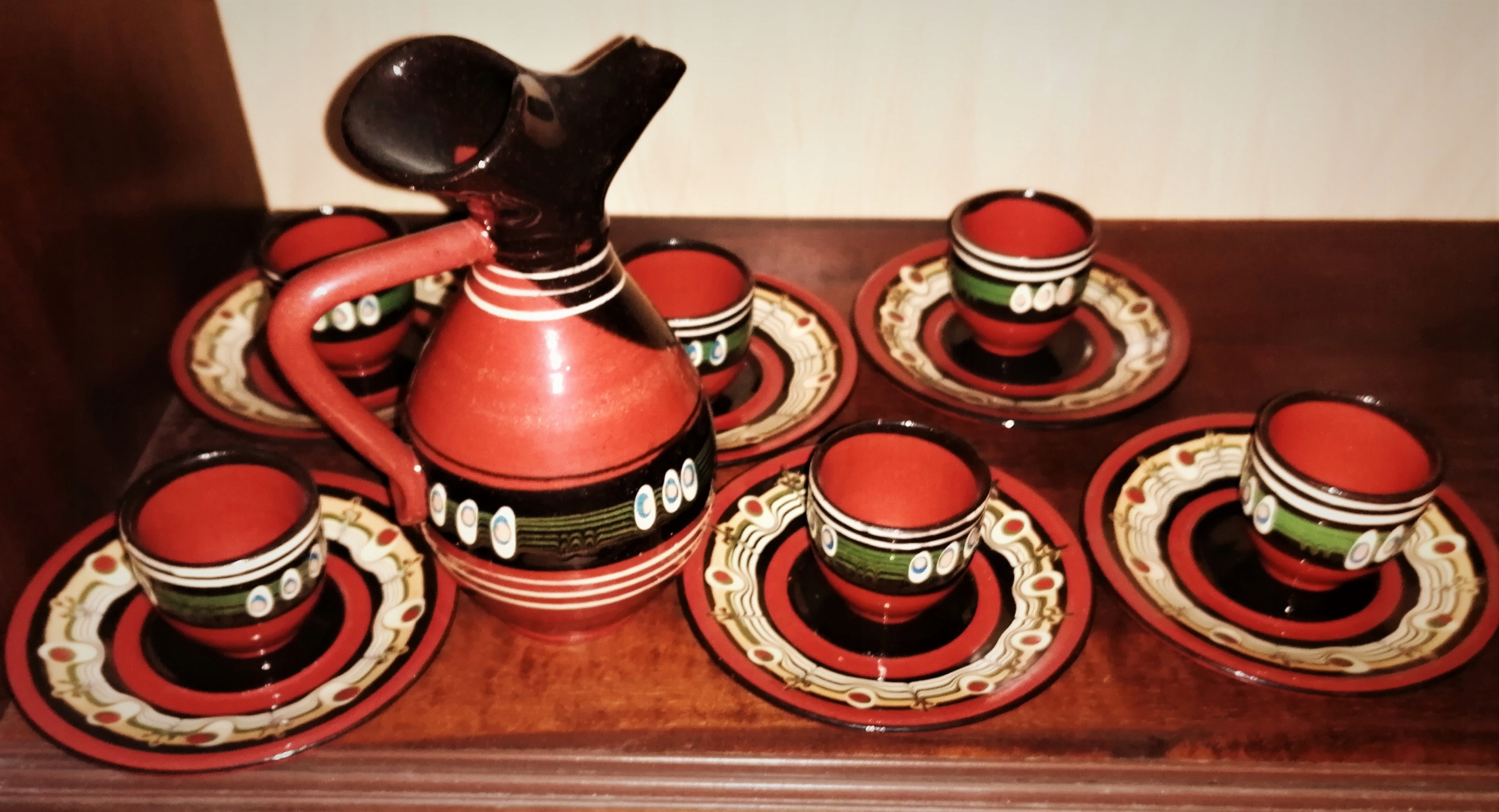 Уникальность набора – материал, из которого изготовлены сосуды. Это красная глина высочайшего качества из окрестностей города Троян в Болгарии. Кирпично-красный цвет посуды – это натуральный цвет глины, покрытой бесцветной глазурью, обожженной, затем украшенной неповторимыми красочными узорами и снова обожженной.