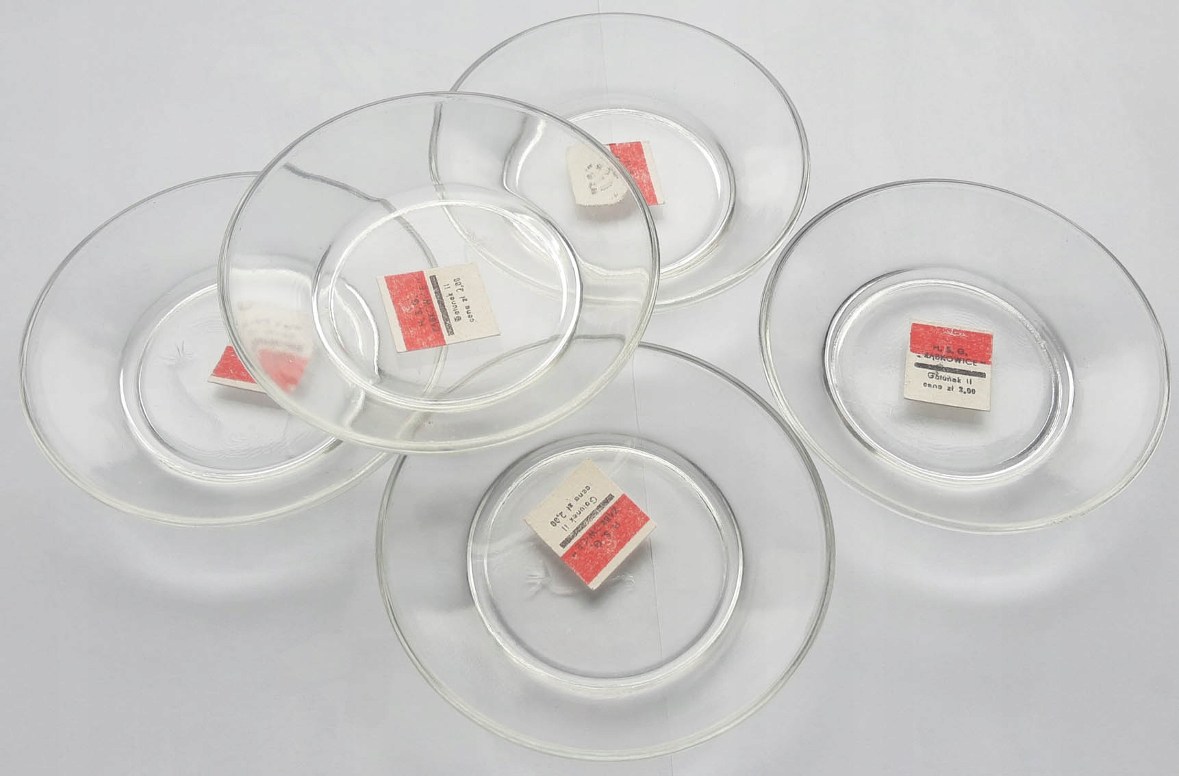 PRL - набор из 5 штук с оригинальными бирками - знак H.S.G. Зомбковице - II сорт и каждое из этих блюдец имеет какой-то изъян в стекле, видимый как размытие, какой-то след (который виден на фотографиях) - цена за весь набор из 5 штук - диаметр блюдца 9,5 см.