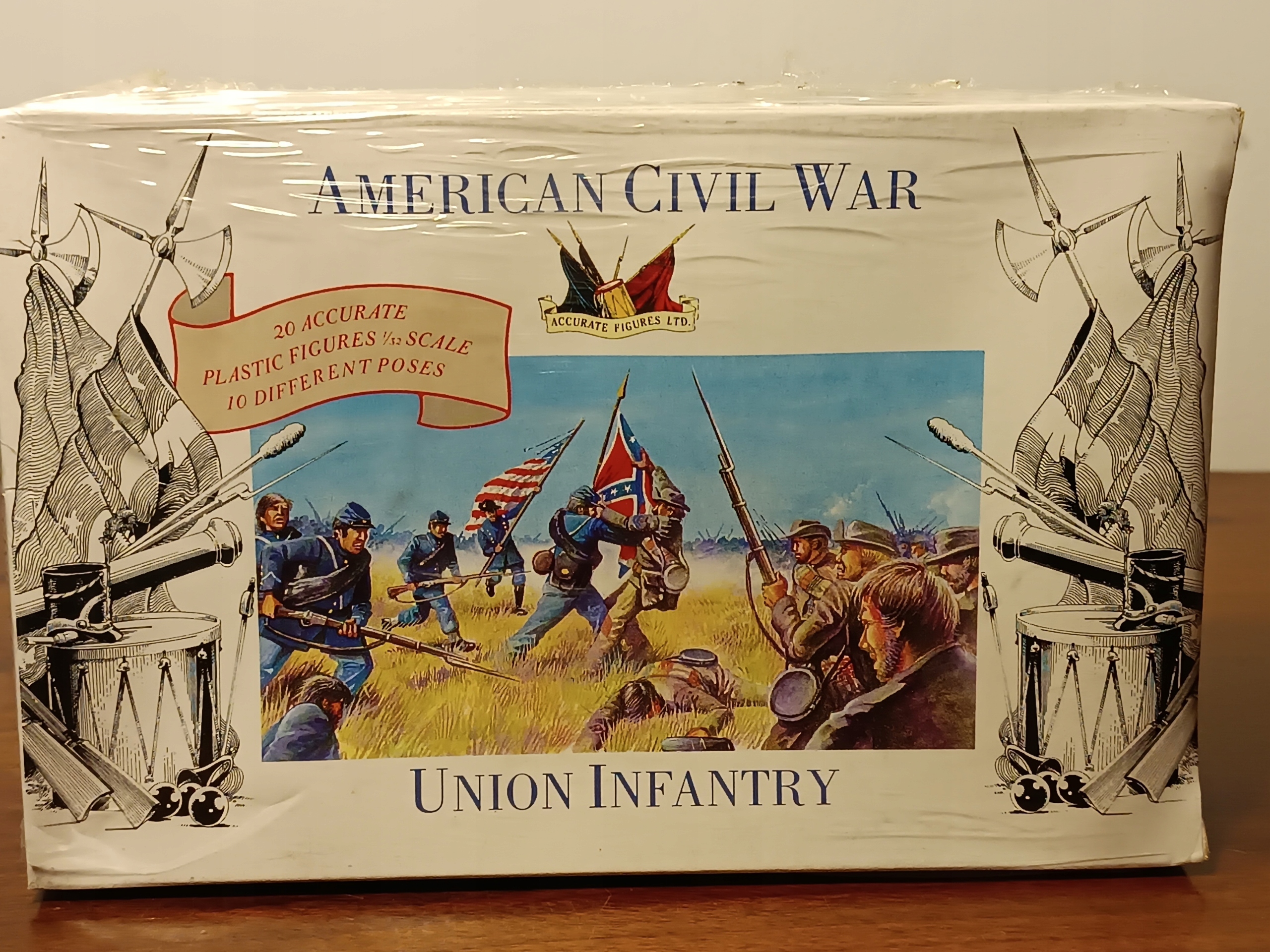 Полный набор старых фигурок британского производства компании Accurate в запечатанной заводской коробке. Фольга до сих пор в очень хорошем состоянии. Солдаты Гражданской войны, Северная пехота. Коробка также в очень хорошем состоянии.