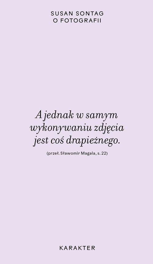 Автор анализирует работу выдающихся фотографов, цитирует тексты писателей и философов, но также пишет о фотографии как часть повседневной жизни, своего рода социального ритуала, пытаясь понять его функцию и смысл. Знаменитая книга Сьюзен Сонтаг - это не только коллекция блестящих фотографий, но и захватывающий, тщательный анализ современного мира . Потому что, как она пишет, собирать фотографии - значит собирать мир. "
