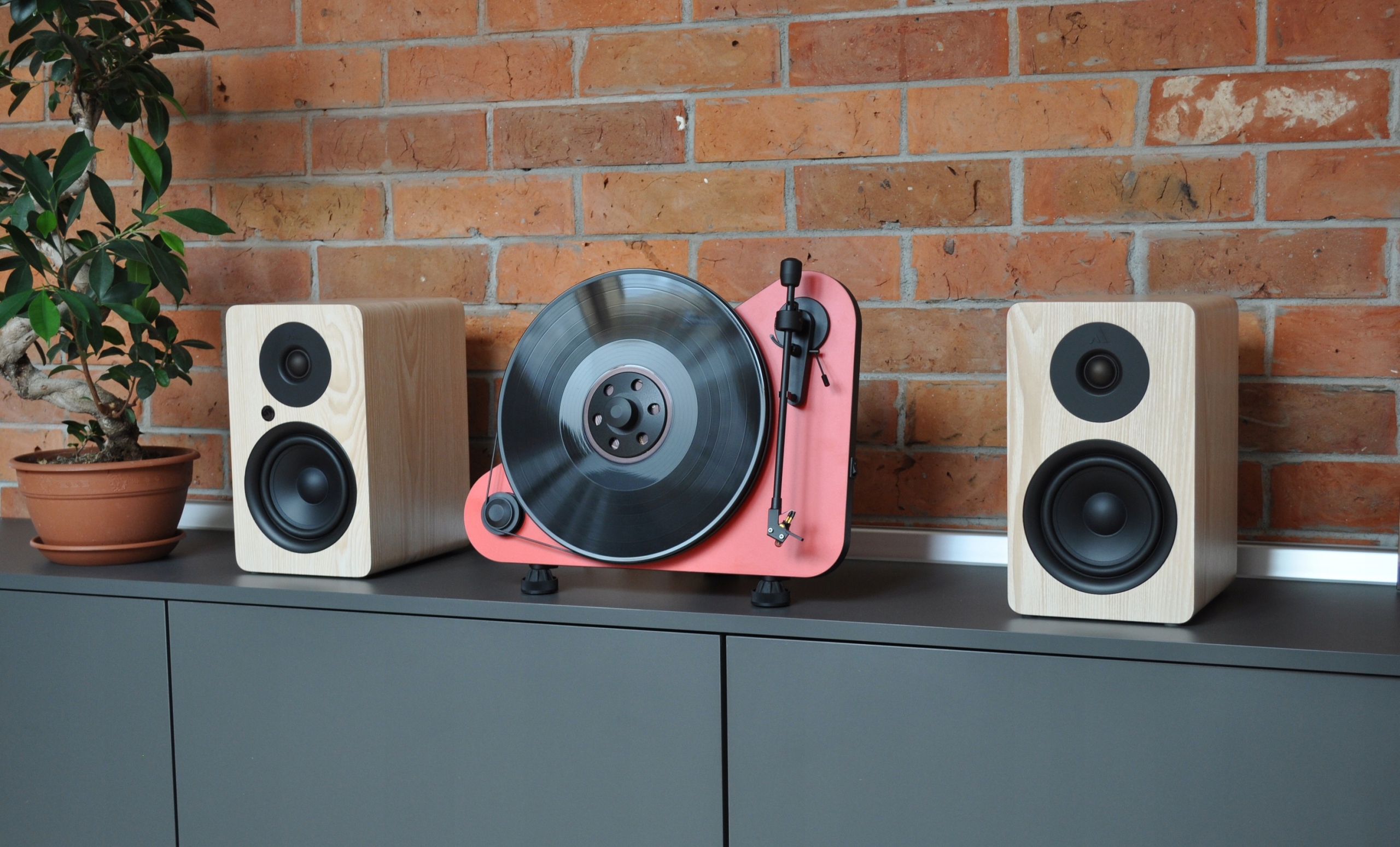 Pro-Ject VT-E R матового красного цвета + Argon Audio Alto A5, пара активных динамиков пепельного цвета.