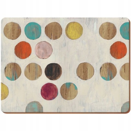 Набор больших пробковых подставок для стола (под тарелки) от английской компании Creative Tops с мотивом из крупных разноцветных точек , на сером неоднородном фоне.
