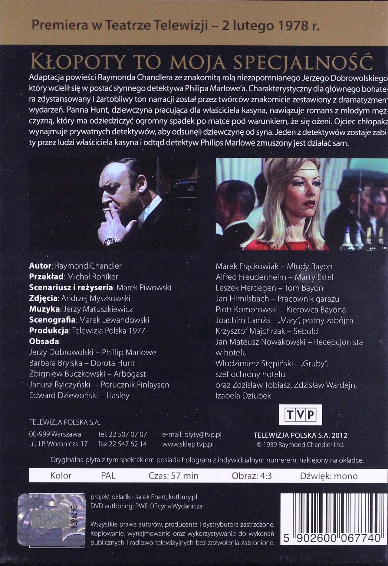 Активация романа Рэймонда Чендлера с прекрасной ролью незабвенного Ежи Добровольского, сыгравшего роль знаменитый сыщик Филип Марлоу. Отстраненный и шутливый тон повествования, свойственный главному герою, прекрасно сочетался создателями с драматизмом событий. Мисс Хант, девушка, работающая на владельца казино, заводит роман с молодым человеком, которому предстоит унаследовать огромное наследство от ее матери, если она выйдет замуж. Отец мальчика нанимает частных детективов, чтобы разлучить девочку с сыном. Один из детективов убит людьми владельца казино, и с этого момента детектив Филипс Марлоу вынужден действовать в одиночку.