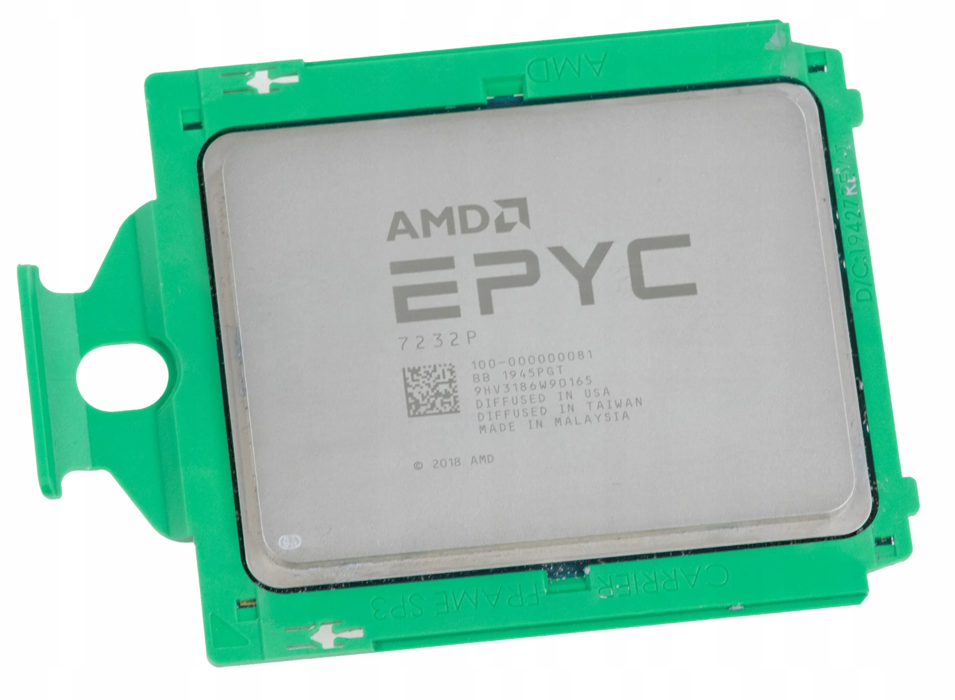 AMD EPYC 7232P — 8-ядерный 16-поточный процессор на базе архитектуры Zen 2, выпущенный в августе 2019 года. Процессор работает с базовой частотой 3,1 ГГц, а в режиме Turbo может достигать 3,2 ГГц. Он предназначен для серверных приложений и поддерживает память DDR4-3200. с коррекцией ошибок ECC, обеспечивающей стабильность в критических средах. EPYC 7232P имеет 32 МБ кэш-памяти L3 и поддерживает 128 линий PCIe 4.0, что позволяет расширять серверы с помощью дополнительных компонентов и карт расширения. TDP процессора составляет 120 Вт, что требует адекватного охлаждения в средах с высокой нагрузкой.