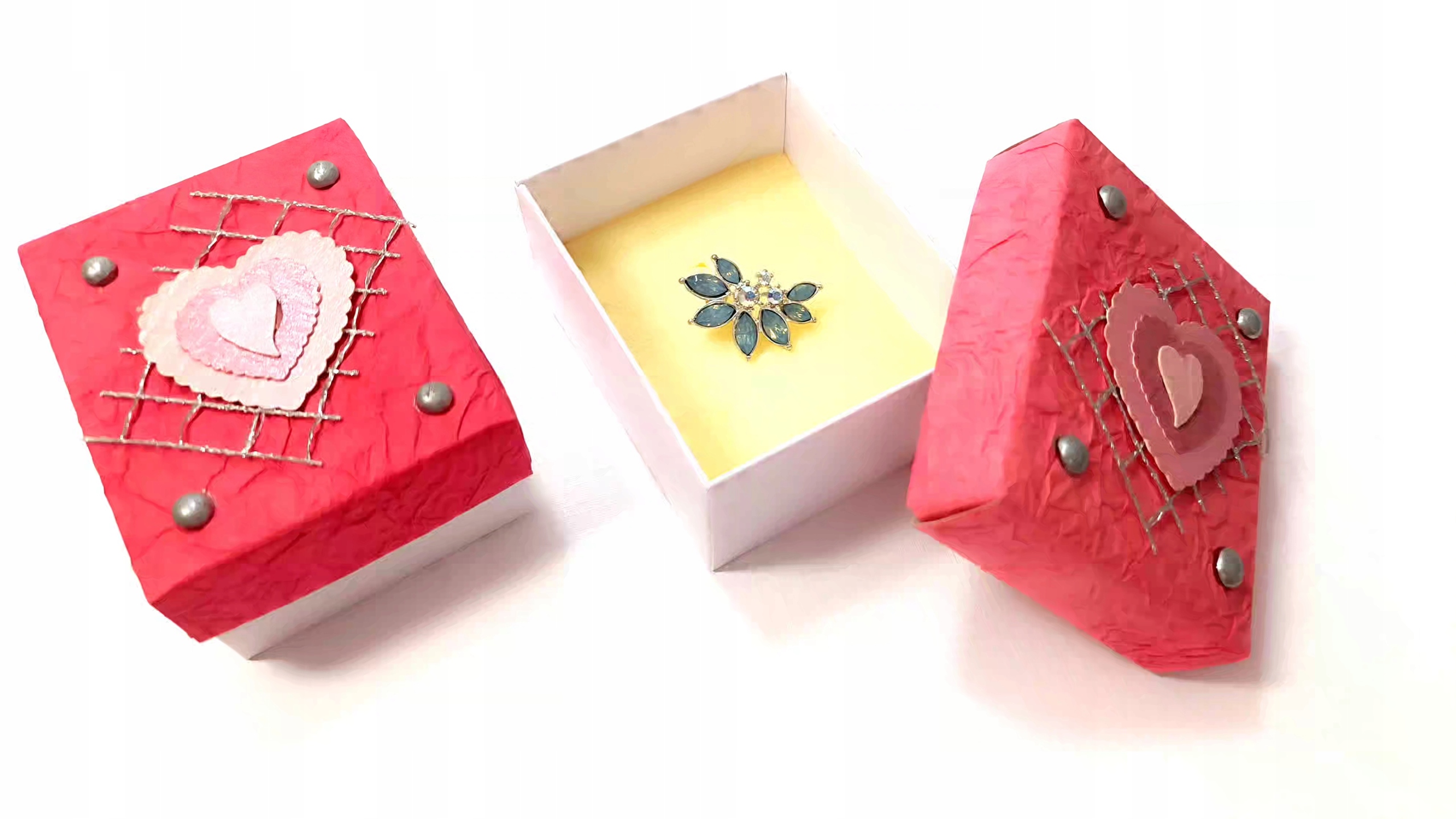 коробка из картона, где крышка покрыта декоративной бумагой с розовой мятой. Дно упаковки белая,