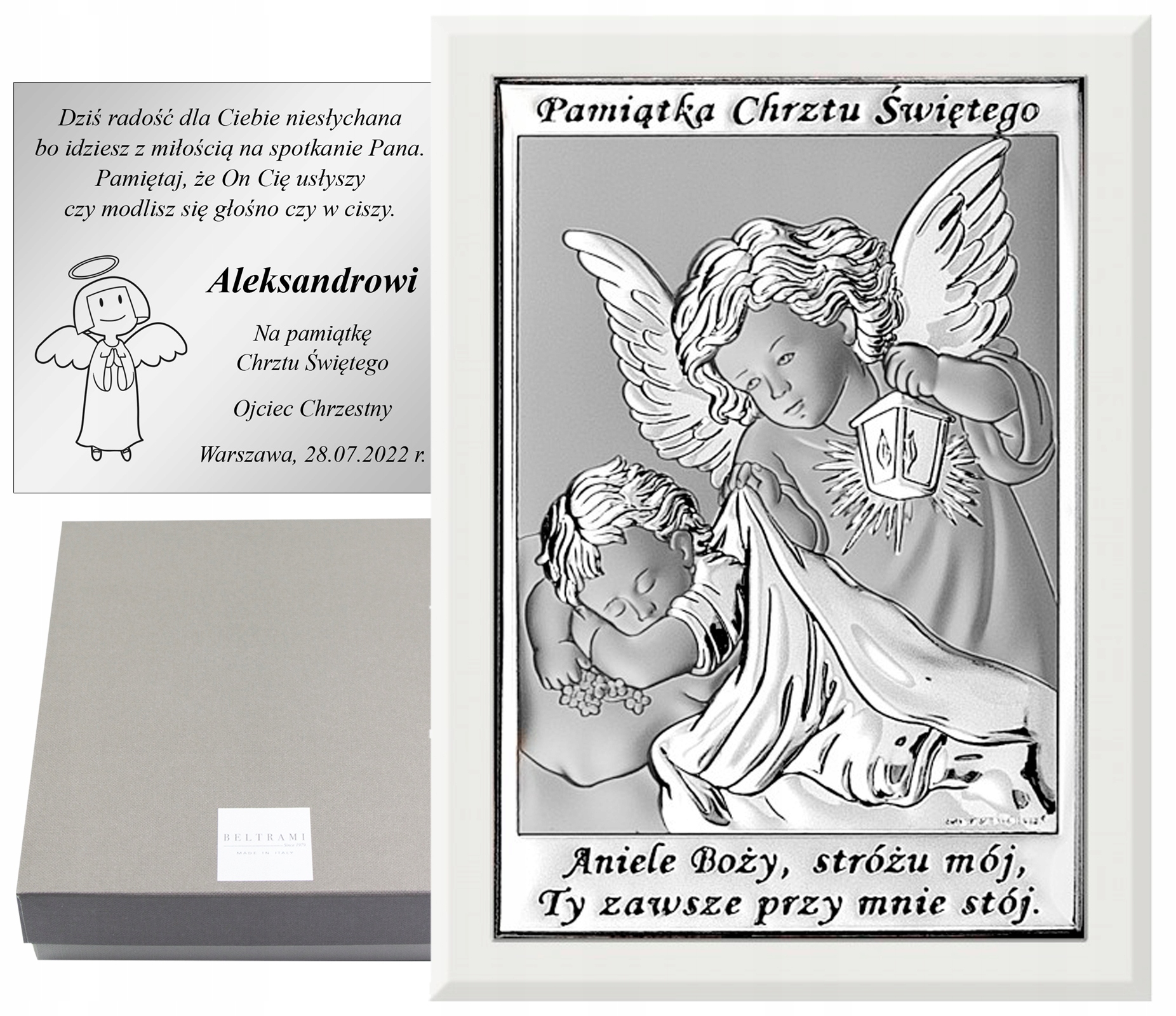 Картина с изображением Ангела-Хранителя с подписью – прекрасный подарок ко Святому Крещению. Качественное исполнение, изысканная отделка, элегантная упаковка - все это создает уникальный сувенир на долгие годы... Картина еще и чрезвычайно практична: у нее есть встроенная подставка, поэтому ее можно разместить на шкафу или комоде. или повесьте его на стену.