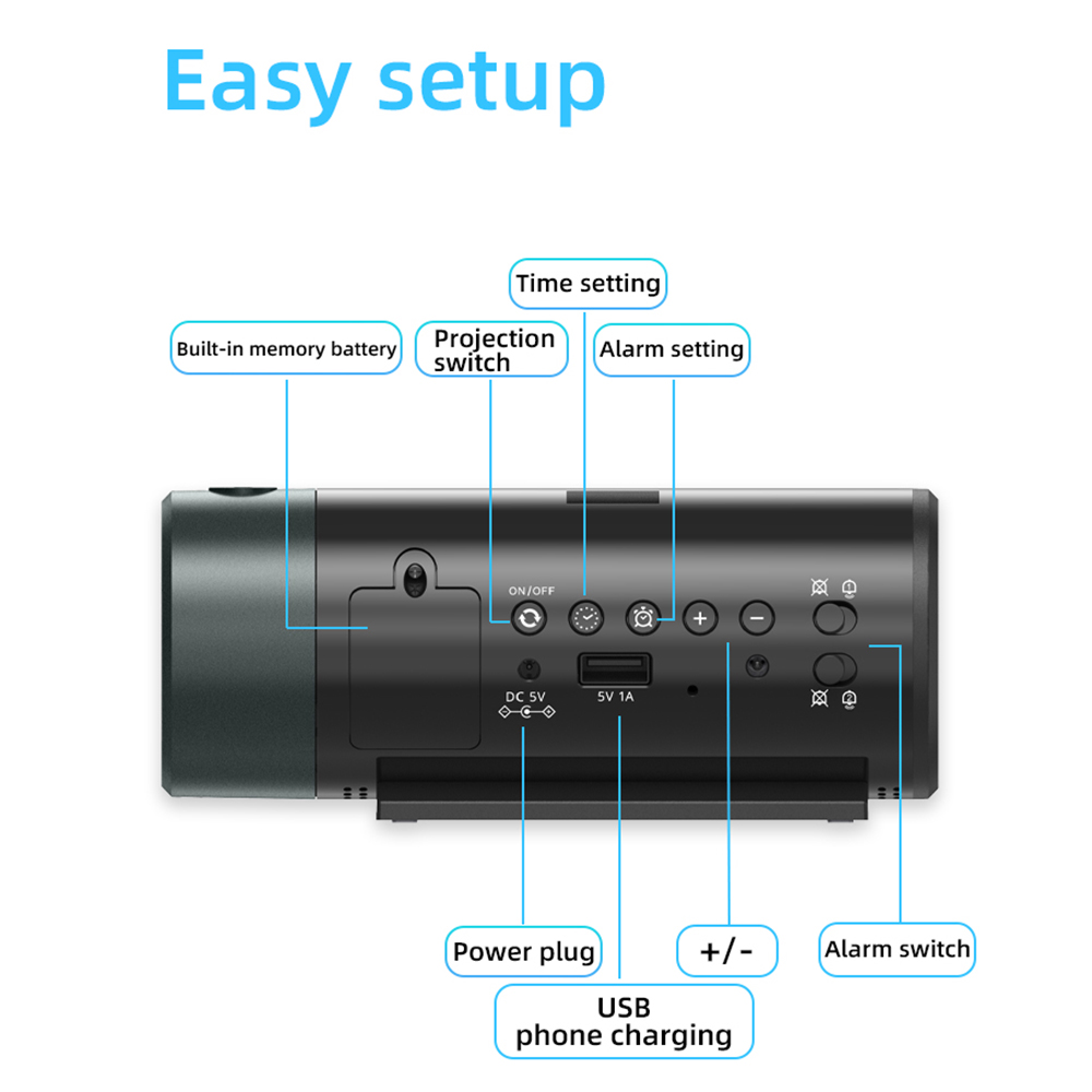 - Двойной будильник и функция повтора — наш электронный цифровой Будильник проектора разработан с двойной будильник, который может разбудить вас и вашего спутника в разное время или двойное пробуждение специально для вас. Нажмите кнопку повтора сверху, чтобы установить время сна на 5–60 минут, пока не сработает сигнализация.