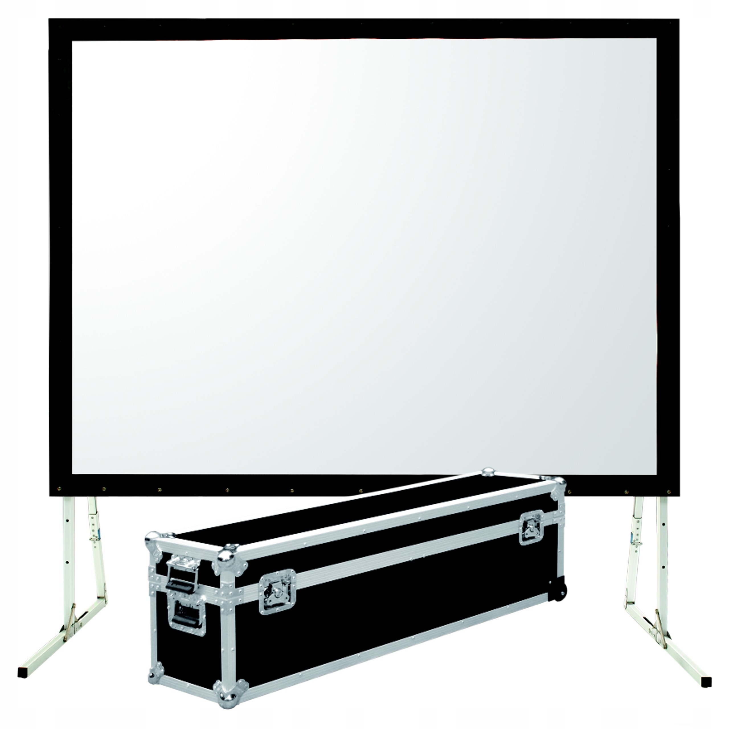 Складной портативный рамочный проекционный экран из профессиональной линейки Suprema Orion, оснащенный ПЕРЕДНЕЙ проекционной поверхностью, адаптированной для фронтального проецирования.