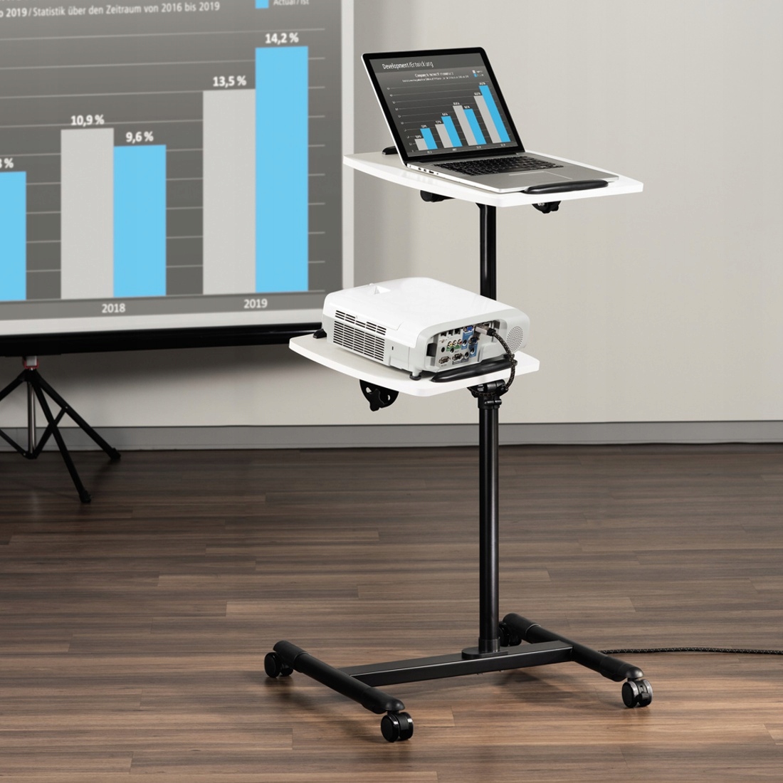 Наш стол для проектора позволяет идеально расположить диапроектор или проектор, гарантируя, что он поместится на экране. Благодаря двум регулируемым платформам вы можете легко регулировать высоту, угол наклона, а также поворачивать платформу на 360°.