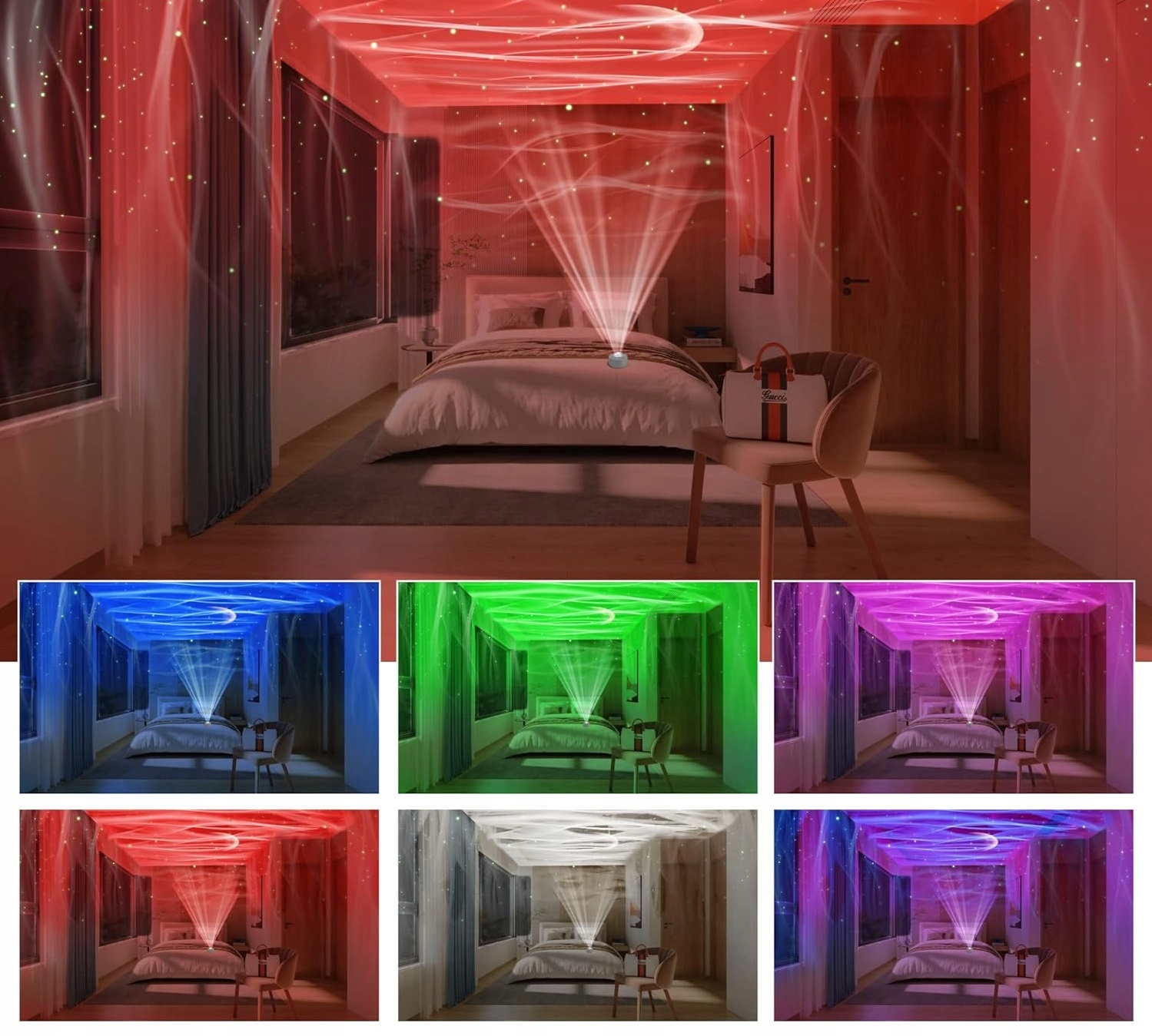 14 цветовых режимов проектора Aurora: наслаждайтесь потрясающим световым шоу в 14 различных цветовых комбинациях, которые превратят ваше пространство в волшебное место. Светом можно легко управлять с помощью пульта дистанционного управления или кнопки на светильнике.