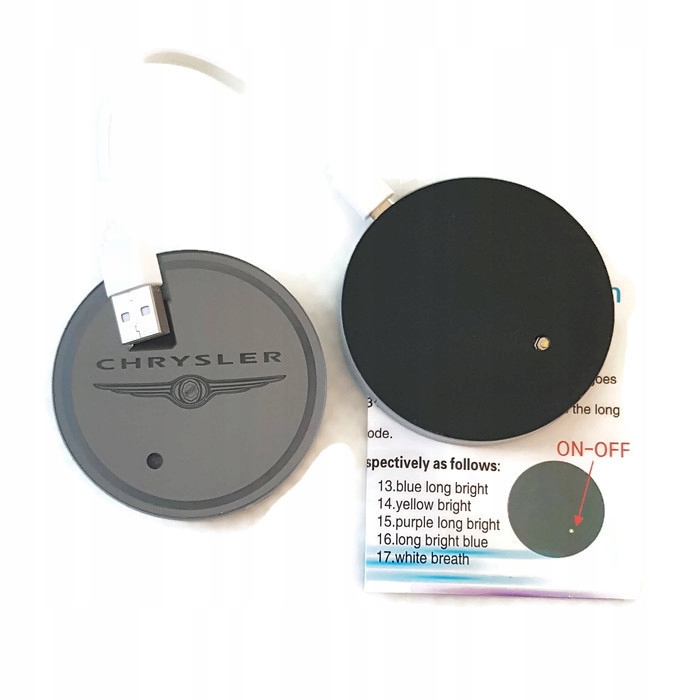 Комплект из двух автоматически включающихся светодиодных проекторов/панелей с логотипом Chrysler, которые можно разместить, например, вместо подстаканников в автомобиле.